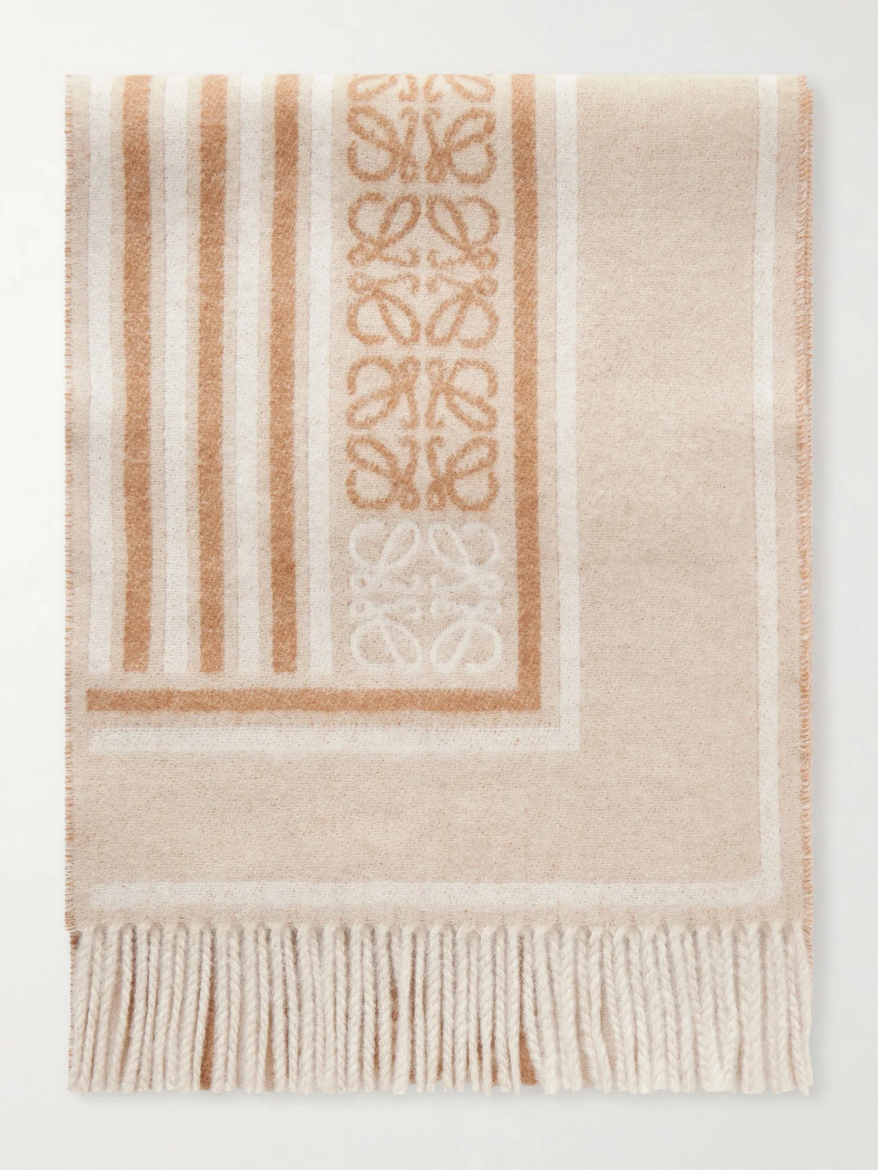 Loewe's scarf is jacquard-knitted with tonal 'Anagram' emblems and stripes, so it'll complement a range of outfits. It's spun from wool and cashmere-blend that's soft and insulating and has fringed trims.