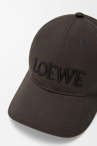 Cap in cotton canvas with a LOEWE embroidery at the front and a Louis Wain Futurist Cat motif at the back. This hat is inspired by Louis Wain's "Futurist Cats" porcelain vase series. - Adjustable strap with metal slider - Striped cotton canvas lining - LOEWE embossed calfskin patch at the back Colour: Brown/Black Metallic colour: Palladium Main material: Cotton Weight: 0.11 kg Made in: Italy