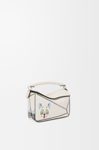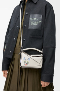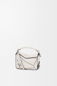 The Puzzle is defined by its distinctive geometric lines and its cuboid form. This mini version is crafted in classic calfskin with leather marquetry Futurist Cat motifs. This bag is inspired by Louis Wain's "Futurist Cats" porcelain vase series. - Shoulder, crossbody or hand carry - Detachable and adjustable strap - Zip closure with calfskin pull - Futurist Cat striped cotton canvas lining - Embossed Anagram Colour: Soft White Metallic colour: Palladium Main material: Classic calf Strap length: 108.5 - 137 cm Strap drop: 54.5 - 68.5 cm Handle drop: 4 cm Weight: 0.25 kg Height: 12.5 cm Width: 17.5 cm Depth: 7.5 cm Made in: Spain