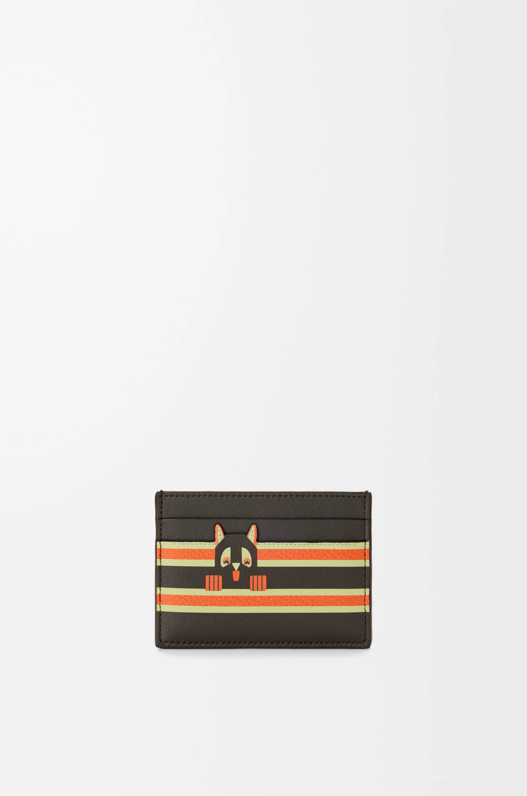 Cardholder in classic calfskin featuring two-tone stripes, a leather marquetry Futurist Cat and printed lettering on the reverse. This cardholder is inspired by Louis Wain's "Futurist Cats" porcelain vase series. - Four card slots, one central pocket - Calfskin lining - Embossed Anagram Colour: Dark Taupe/Orange Main material: Classic calf Weight: 0.027 kg Height: 7.5 cm Width: 10.3 cm Depth: 0.3 cm Made in: Spain