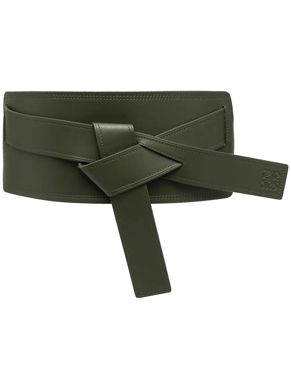 Gate leather belt khaki green leather logo stamp to the front tied waist adjustable snap fastening to the rear Imported Composition Calf Leather 100% SIZE & FIT Measurement Minimum Length 25.59 in(65 cm) TOTAL LENGTH 27.55 in(70 cm) WIDTH 4.72 in(12 cm) Washing instructions Do Not Wash/Do Not Dry Clean