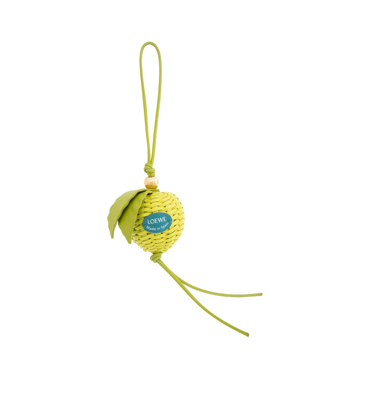 Loewe Granny Apple charm in woven cord on a looped calfskin strap with an Anagram Pebble dice. 31.5 cm x 6.5 cm. Made in Spain. DESIGNER STYLE ID: C621232X0Z COLOR: 4100 GREEN