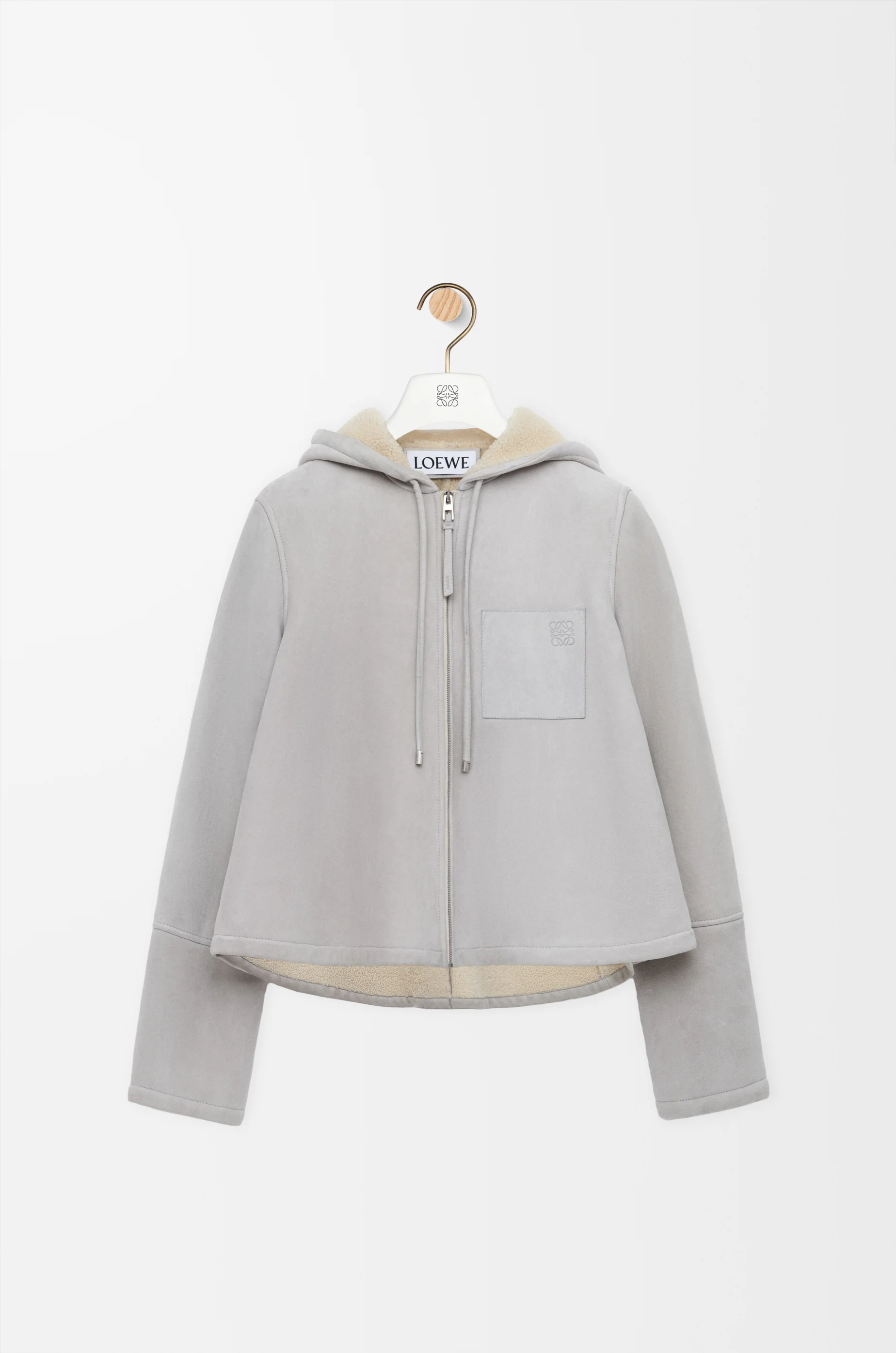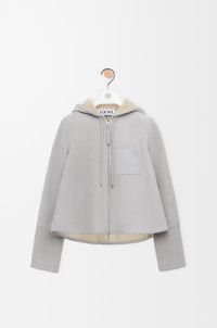 Jacket in medium-weight curly Merino shearling featuring a trapeze silhouette. - Relaxed fit, short length - Hooded collar with drawstring - Zip front fastening with leather puller - Chest patch pocket - Embossed Anagram placed on the chest pocket Colour: Light Grey Melange Main material: Shearling Weight: 1.4 kg Made in: Italy Materials & care Main Material: 100% lambskin