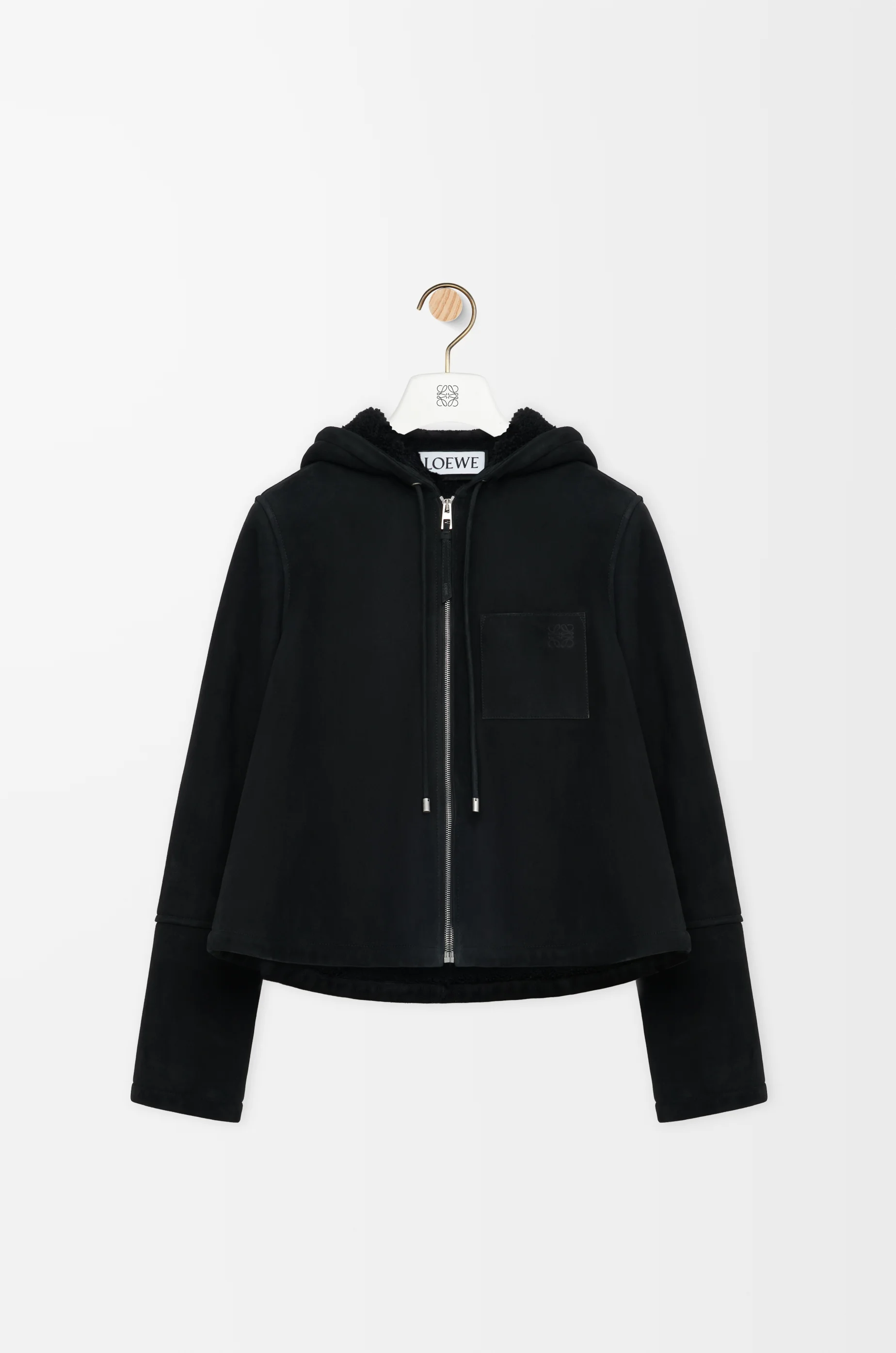 Jacket in medium-weight curly Merino shearling featuring a trapeze silhouette. - Relaxed fit, short length - Hooded collar with drawstring - Zip front fastening with leather puller - Chest patch pocket - Embossed Anagram placed on the chest pocket Colour: Black Main material: Shearling Weight: 1.4 kg Made in: Italy Materials & care Main Material: 100% lambskin