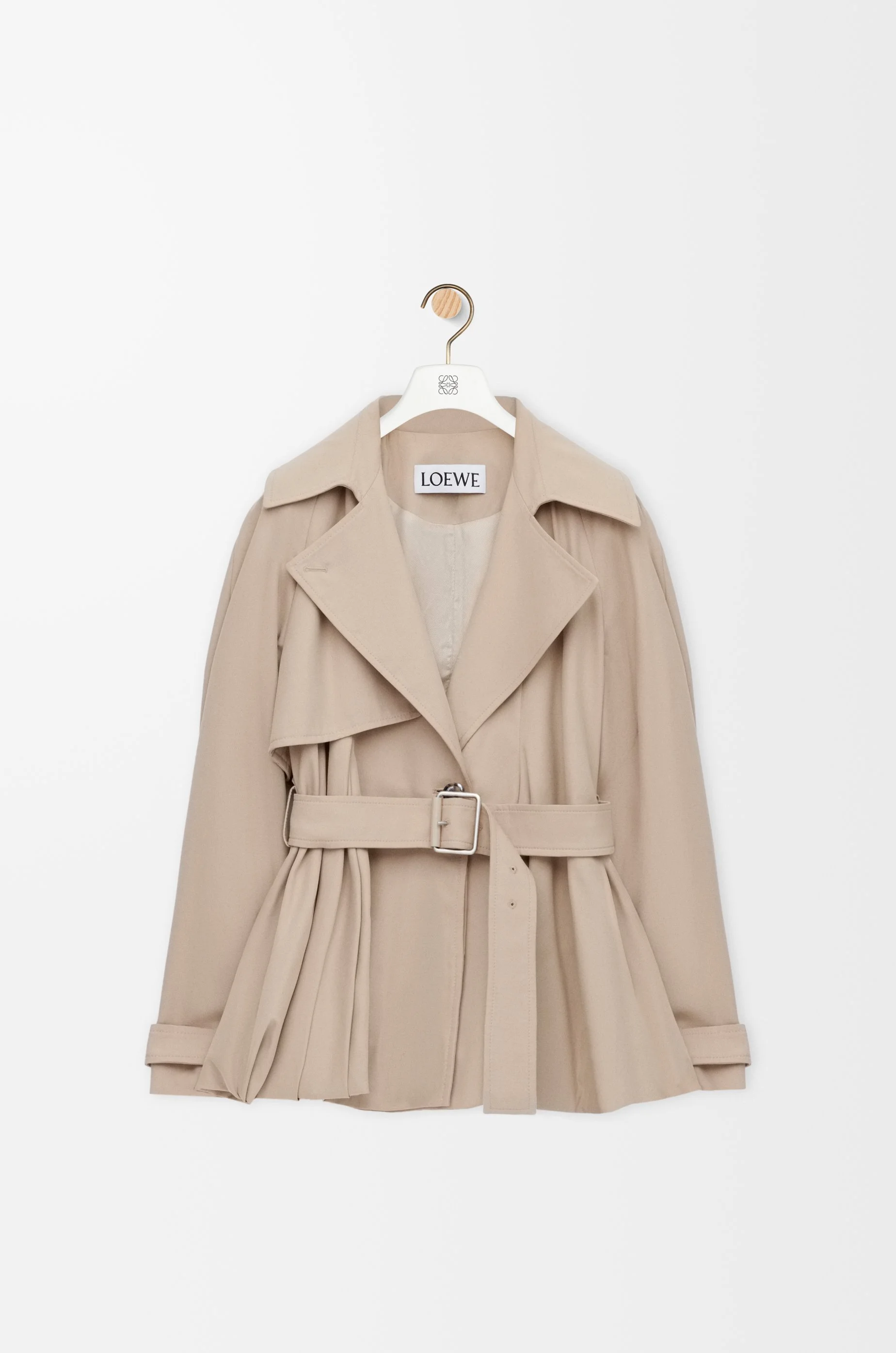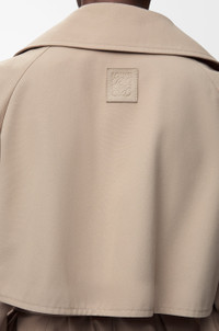 Jacket in lightweight cotton gabardine featuring a balloon silhouette with an adjustable drawstring hem and a storm flap. - Regular fit, regular length - Peak lapel - Button front fastening, removable belt, belted cuffs - Seam pockets, inside welt pocket - Fully lined - LOEWE Anagram embossed leather patch placed at the back Colour: Beige Main material: Cotton Weight: 1.1 kg Made in: Italy Materials & care Main Material: 100% cotton