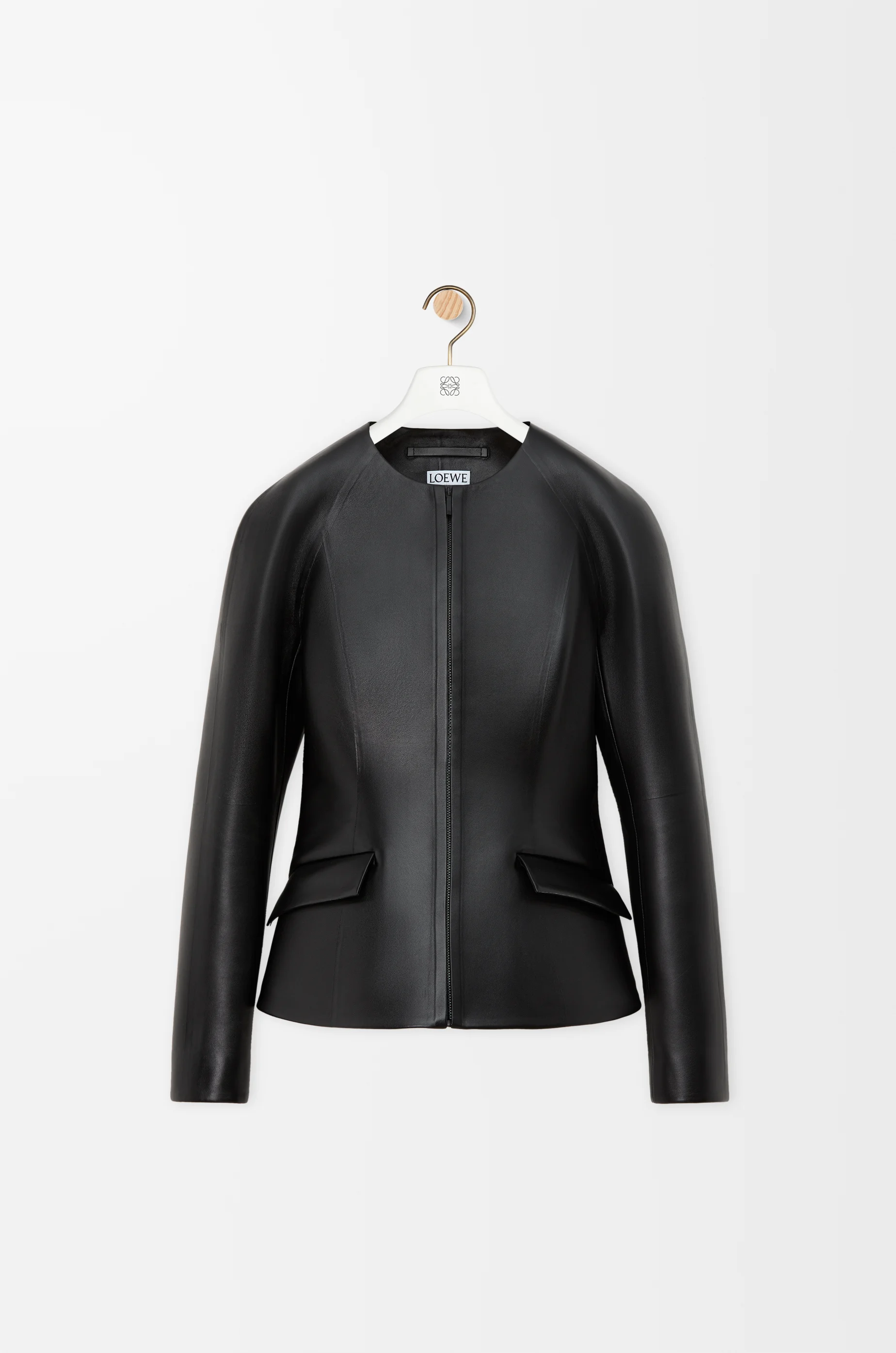 Jacket in medium-weight mellow nappa lambskin featuring a moulded silhouette with neoprene bonding. - Regular fit, regular length - Round neck - Zip front fastening - Flap pockets - LOEWE debossed leather patch placed at the back Colour: Black Main material: Nappa Weight: 0.95 kg Made in: Italy