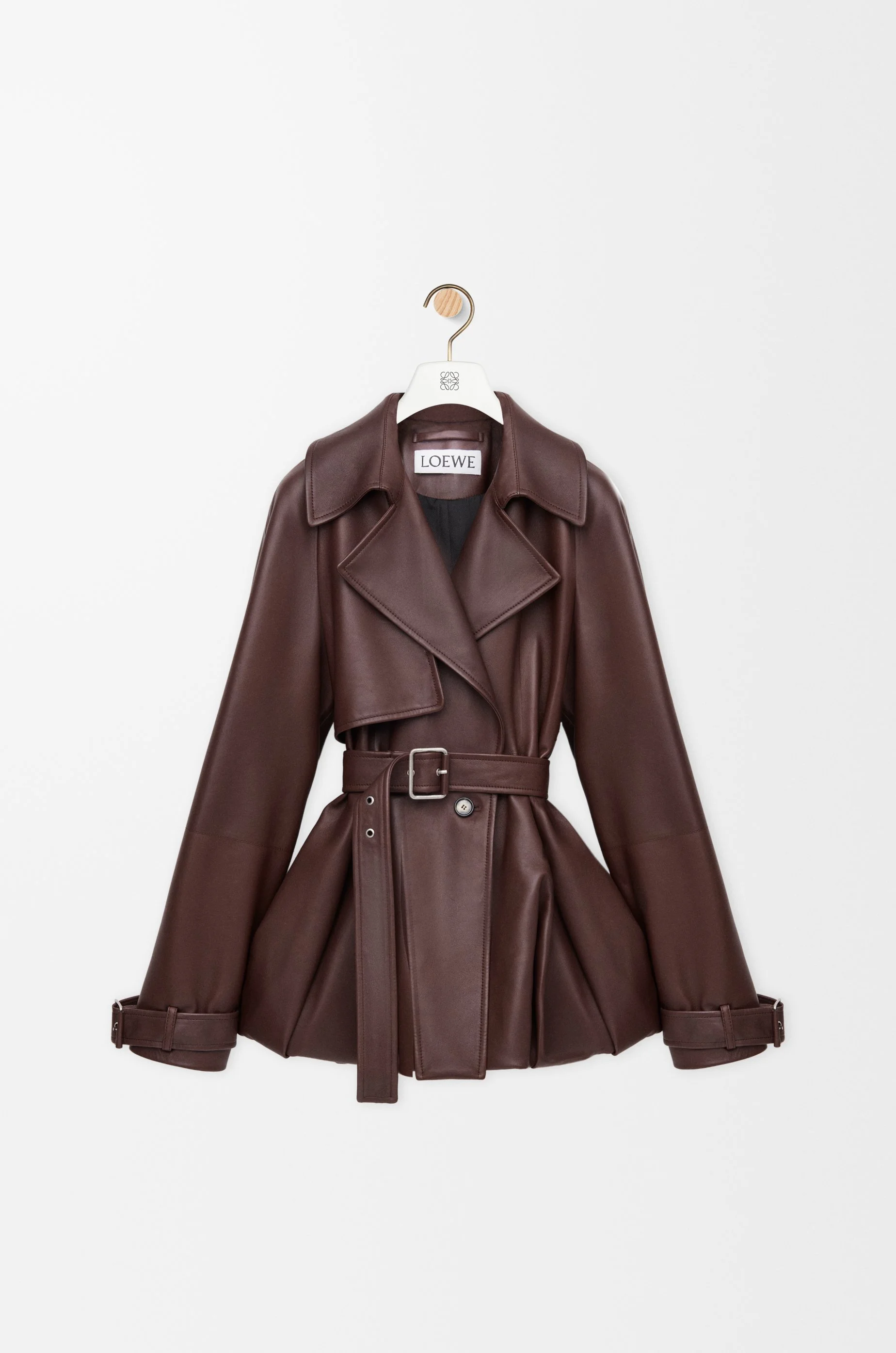 Jacket in lightweight nappa lambskin featuring a balloon silhouette with an adjustable drawstring hem and a storm flap. - Regular fit, regular length - Peak lapel - Button front fastening, removable belt, belted cuffs - Seam pockets, inside welt pocket - Fully lined - LOEWE Anagram embossed leather patch placed at the back Colour: Brown Main material: Nappa Weight: 1.9 kg Made in: Spain Materials & care Main Material: 100% lambskin