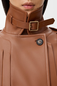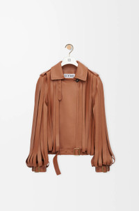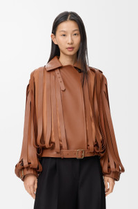 Jacket in medium-weight mellow nappa lambskin featuring a double-breasted construction and a layered design with leather strips over tonal silk lining. - Regular fit, regular length - Classic collar - Belted collar, cuffs and hem - Buttoned shoulder tabs - Button front fastening - Seam pockets - LOEWE Anagram embossed patch placed at the back Colour: Tan Main material: Nappa Weight: 1.7 kg Made in: Spain Materials & care Main Material: 100% lambskin
