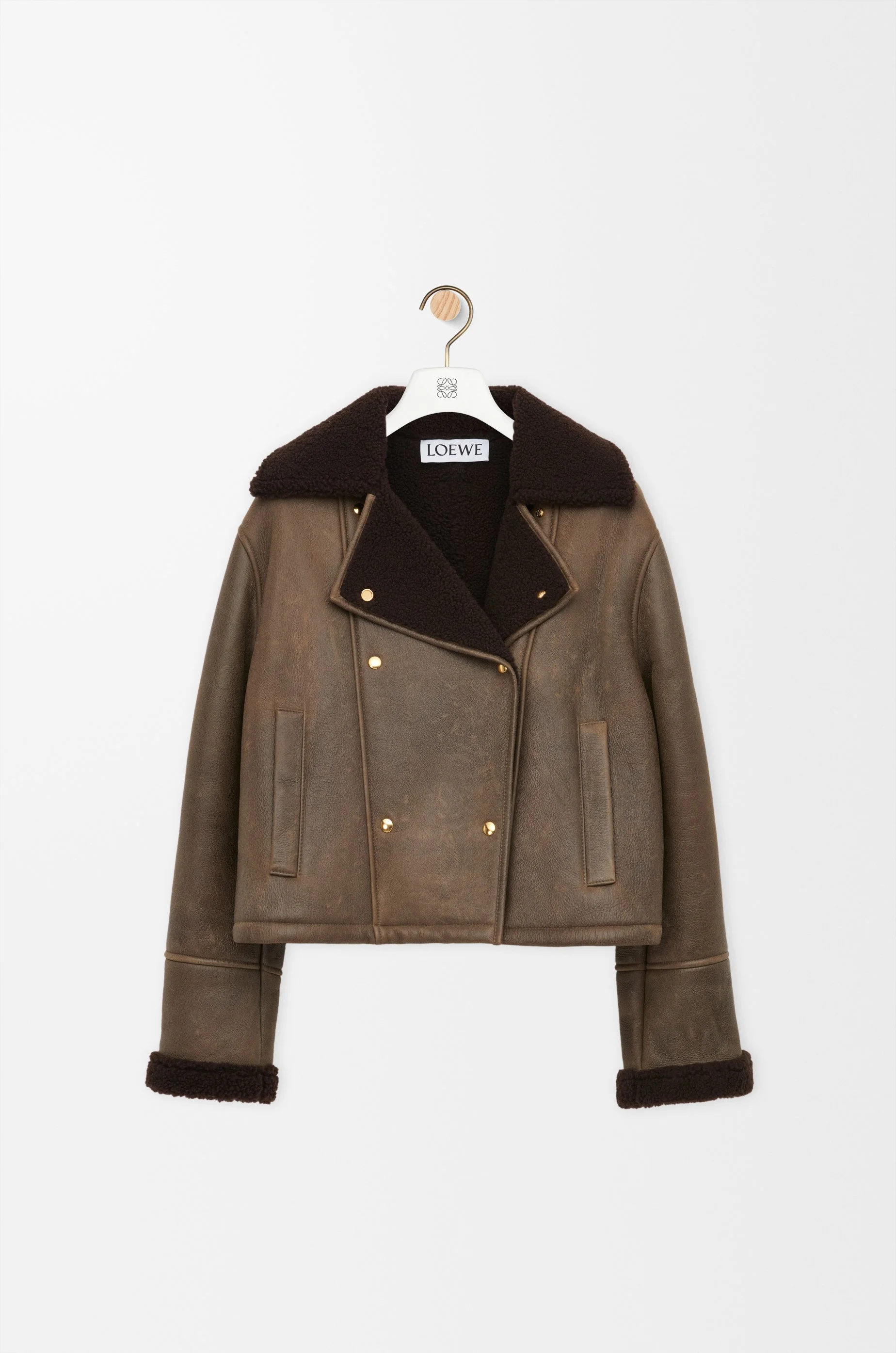 Jacket in medium-weight curly Merino shearling featuring a boxy silhouette and a double-breasted construction. - Regular fit, short length - Shearling collar and cuffs - Snap button front fastening - Vertical welt pockets - LOEWE Anagram embossed leather patch placed at the back Colour: Sage Main material: Shearling Weight: 1.23 kg Made in: Italy Materials & care Main Material: 100% lambskin