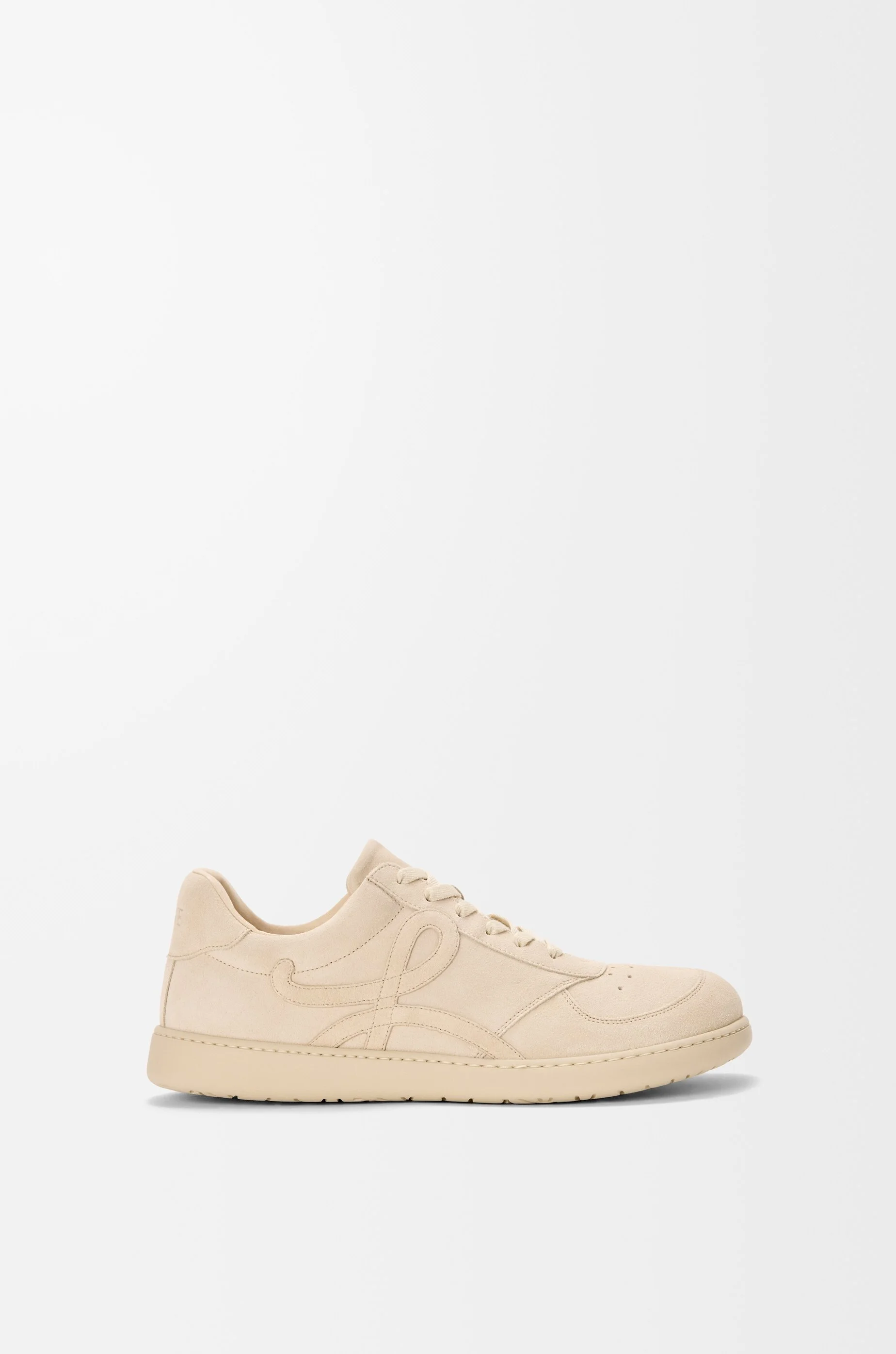 Sneaker in calfskin suede featuring a full monochrome look with an asymmetric toe shape and a nappa fussbett. - 25mm heel - Lace closure - L monogram at the side, embossed LOEWE on the heeltab - Anagram-embossed rubber cupsole Colour: Oat Milk Main material: Calf suede Weight: 0.9 kg Made in: Italy