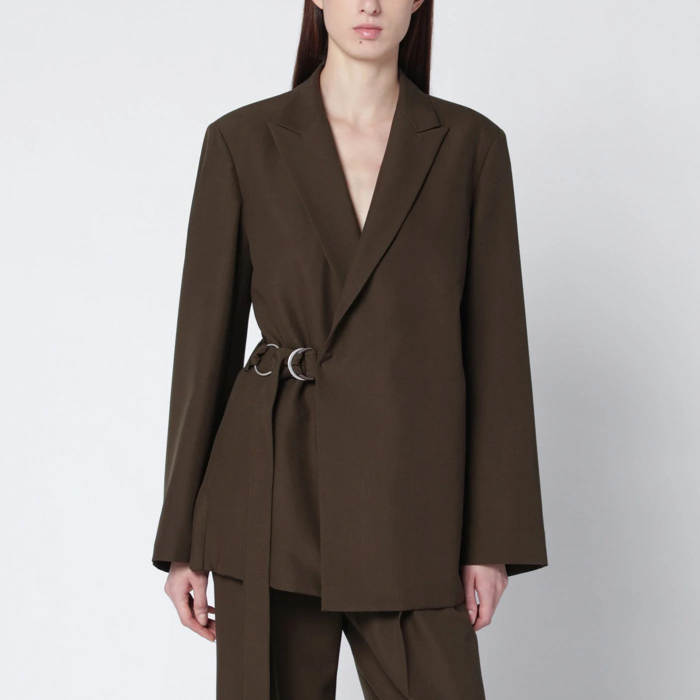 Jacket by Loewe in khaki green wool• Wrap-style front closure• Adjustable side belt with circular buckle detail• Peak lapels• Double back vent• Long sleeves with buttoned cuffs