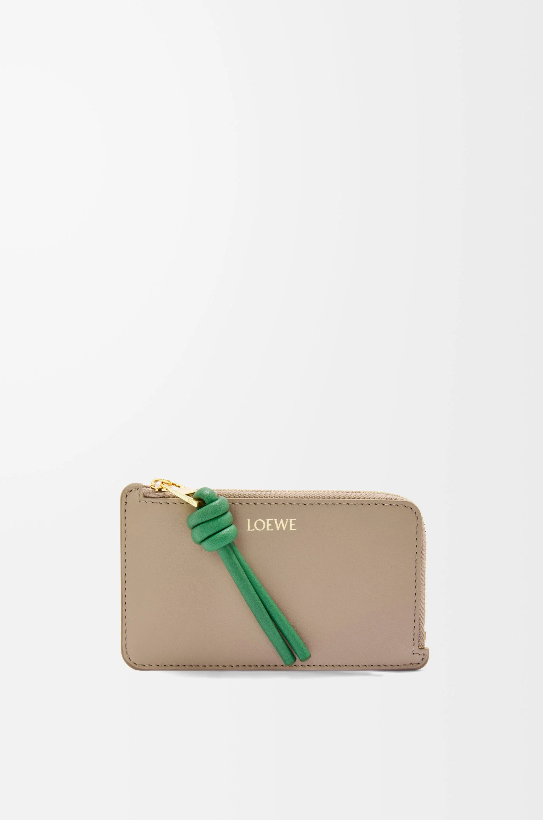 Coin cardholder in shiny nappa calfskin. - Four card slots, zipped compartment - Contrast knot zip pull - Contrast calfskin lining - Gold embossed LOEWE Colour: Sand/Tropical Green Metallic colour: Gold Main material: Shiny Nappa Calf Weight: 0.03 kg Height: 7.5 cm Width: 13 cm Depth: 1 cm Made in: Spain