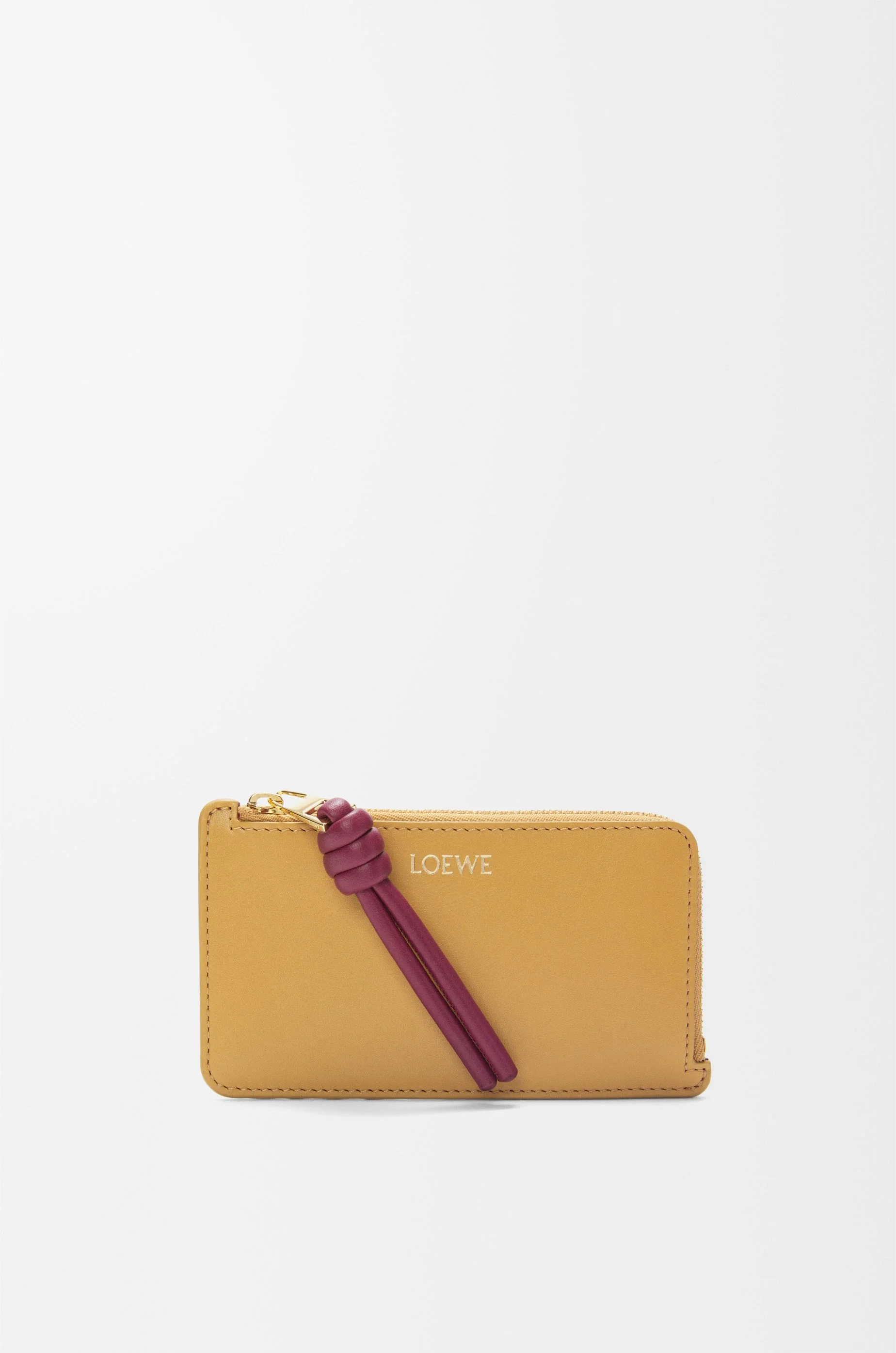 Coin cardholder in shiny nappa calfskin with a contrasting knot zip pull. - Four card slots and one zipped compartment - Contrast calfskin lining - Gold embossed LOEWE Details - Colour : Sahara/Crimson - Metallic colour : Gold - Main material : Shiny Nappa Calf - Weight : 0.03 kg - Height (cm) : 7.5 - Width (cm) : 13 - Depth (cm) : 1 - Height (inch) : 3 - Width (inch) : 5.1 - Depth (inch) : 0.4 - Model ID : CEM1Z40X02 - CIL : - 0011078128 - Made in : Spain