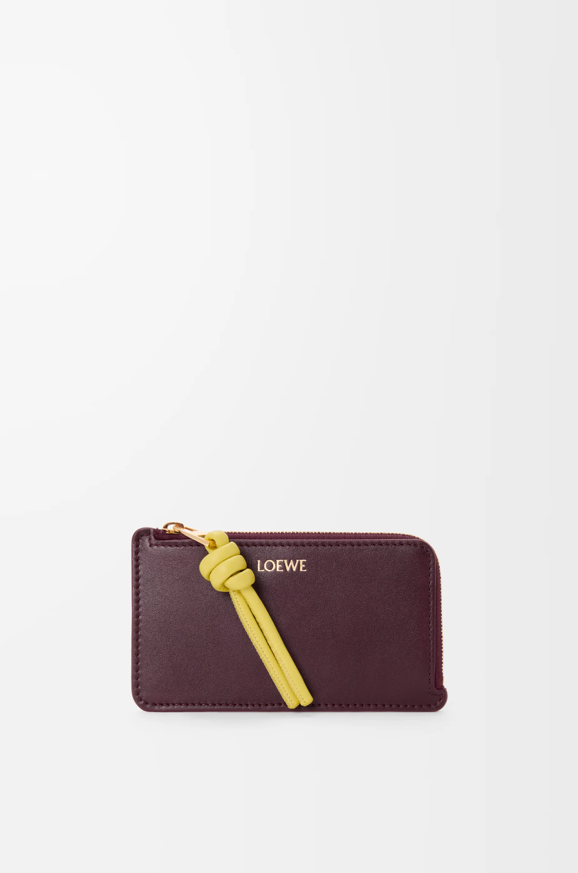 Coin cardholder in shiny nappa calfskin. - Four card slots, zipped compartment - Contrast knot zip pull - Contrast calfskin lining - Gold embossed LOEWE Colour: Dark Burgundy/Light Citrine Metallic colour: Gold Main material: Shiny nappa calf Weight: 0.03 kg Height: 7.5 cm Width: 13 cm Depth: 1 cm Made in: Spain