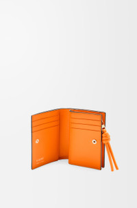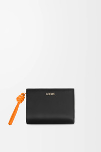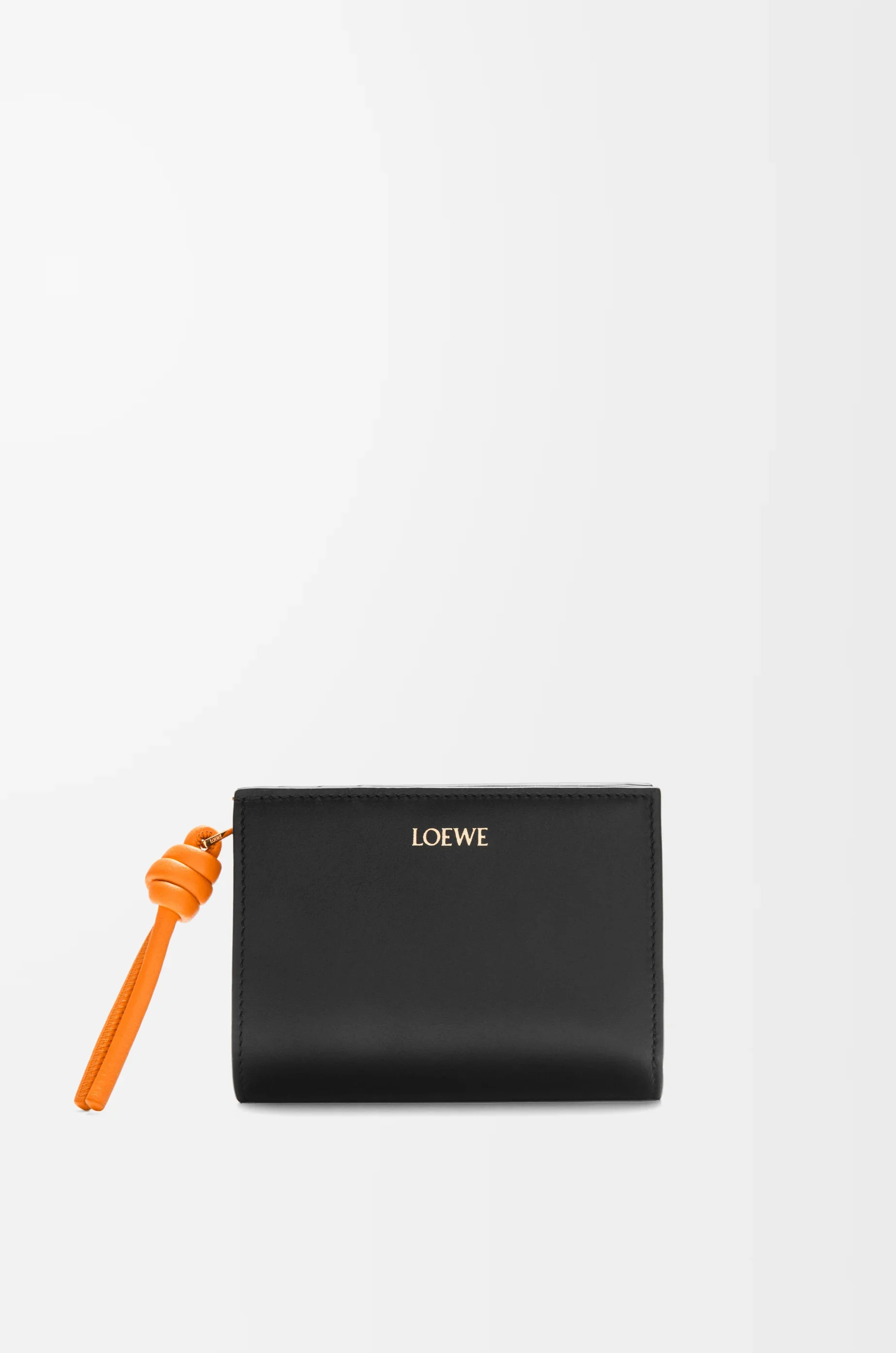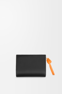 Compact wallet in shiny nappa calfskin with a contrast knot zip pull. - Six card slots, three internal slip pockets - One zipped coin compartment with calfskin pull - Snap button closure - Contrast calfskin lining - Gold embossed LOEWE Details - Colour : Black/Bright Orange - Metallic colour : Gold - Main material : Shiny Nappa Calf - Weight : 0.1 kg - Height (cm) : 8.5 - Width (cm) : 11.4 - Depth (cm) : 3 - Height (inch) : 3.3 - Width (inch) : 4.5 - Depth (inch) : 1.2 - Model ID : CEM1NCWX01 - CIL : - 0011191392 - Made in : Spain