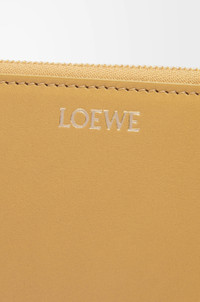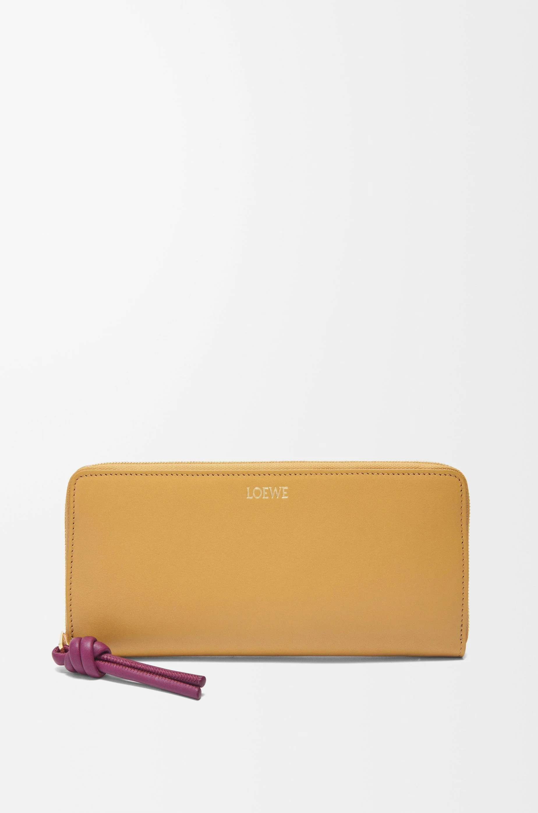 Zip around wallet in shiny nappa calfskin with a contrast knot zip pull. - Four card slots, one slip pocket, two large note pockets - One zipped compartment at the back - Zip closure - Contrast calfskin lining - Gold embossed LOEWE Details - Colour : Sahara/Crimson - Metallic colour : Gold - Main material : Shiny Nappa Calf - Weight : 0.19 kg - Height (cm) : 10 - Width (cm) : 19 - Depth (cm) : 2 - Height (inch) : 3.9 - Width (inch) : 7.5 - Depth (inch) : 0.8 - Model ID : CEM1G39X02 - CIL : - 0011078342 - Made in : Spain