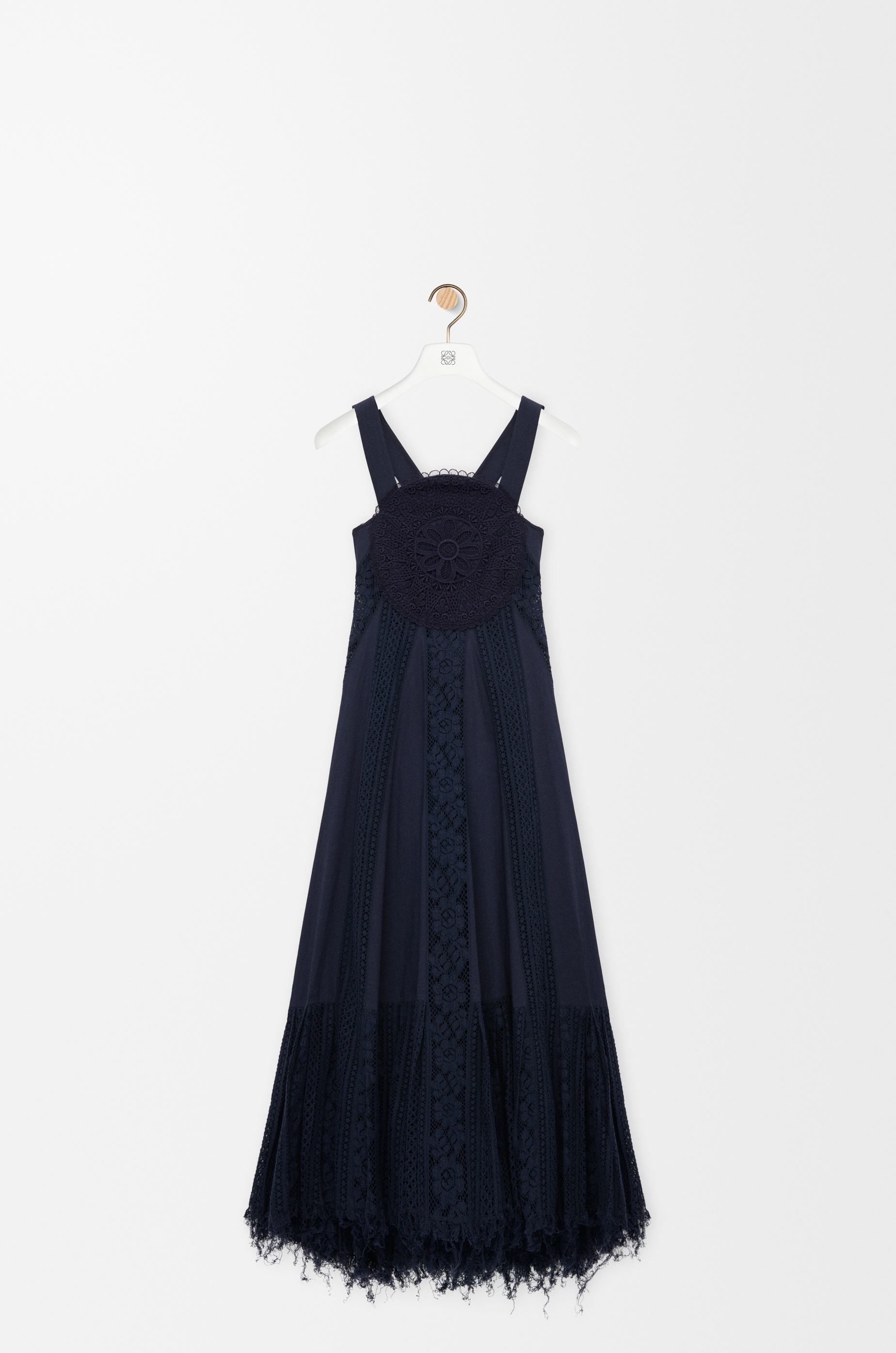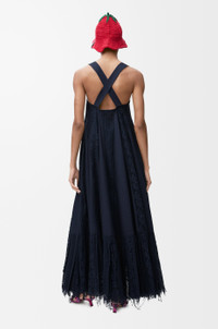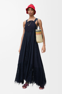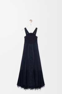 Dress in lightweight cotton poplin featuring a circular lace bodice, an open back with crossed straps and lace inserts down the front and back. - Relaxed fit, long length - Side button fastening - Frayed lace hem - Anagram embroidery placed on the bodice Colour: Navy Blue Main material: Cotton Weight: 1.2 kg