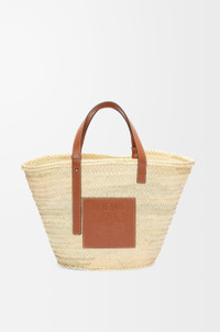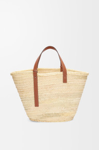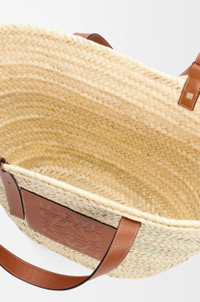 A traditional basket bag elevated with a classic handwoven body and calfskin top handles. This large version is crafted in palm leaf and calfskin. - Shoulder or top handle carry - Adjustable top handles - Customisable with strap and personalised charms - Unlined - Embossed Anagram patch - Due to its handcrafted nature, sizes may differ slightly, making every purchase unique Details - Colour: Natural/Tan - Metallic colour: Palladium - Main material: Palm Leaf/Calf - Handle drop: 22.0 cm - Weight: 0.57 kg - Height (cm): 34.5 - Width (cm): 57 - Depth (cm): 30 - Height (inch): 13.6 - Width (inch): 22.4 - Depth (inch): 11.8 - Model ID: 327.02.S81 - CIL: 0010111474 - Made in: Spain