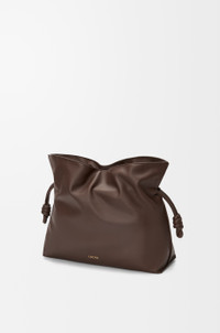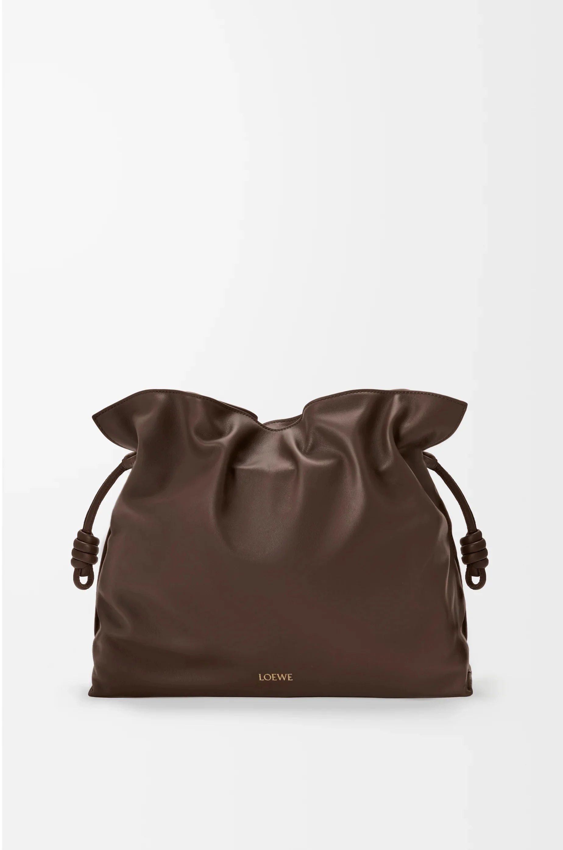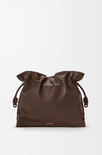 The Flamenco clutch is a soft and slouchy bag with a cinched closure and historical knot drawstrings. This large version is crafted in nappa calfskin. - Shoulder or hand carry - Magnetic closure - One internal zipped pocket - Herringbone cotton canvas lining - Gold or silver embossed LOEWE Colour: Chocolate Metallic colour: Gold Main material: Nappa Calf Handle drop: 29 cm Weight: 0.64 kg Height: 29 cm Width: 38 cm Depth: 14 cm Made in: Spain