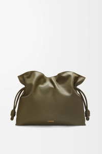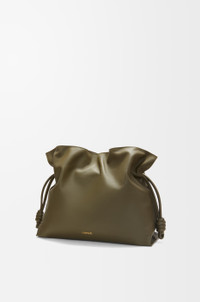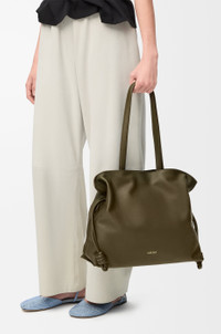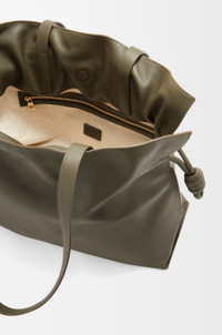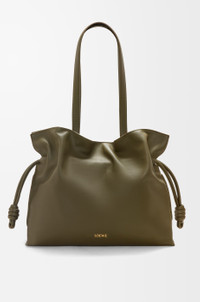 Launched in the 1980s, the Flamenco cinches closed using drawstring pulls finished in its signature coiled knots. This large version is crafted in nappa calfskin. - Shoulder carry - Calfskin top handles - Discreet magnetic closure - One interior zipped pocket - Herringbone cotton canvas lining - Gold or silver LOEWE embossed Details - Colour: Dark Khaki Green - Metallic colour: Gold - Main material: Nappa Calf - Handle drop: 29 cm - Weight: 0.64 kg - Height (cm): 29 - Width (cm): 38 - Depth (cm): 14 - Height (inch): 11.4 - Width (inch): 15 - Depth (inch): 5.5 - Model ID: A411FL1X18 - CIL: 0011034618 - Made in: Spain