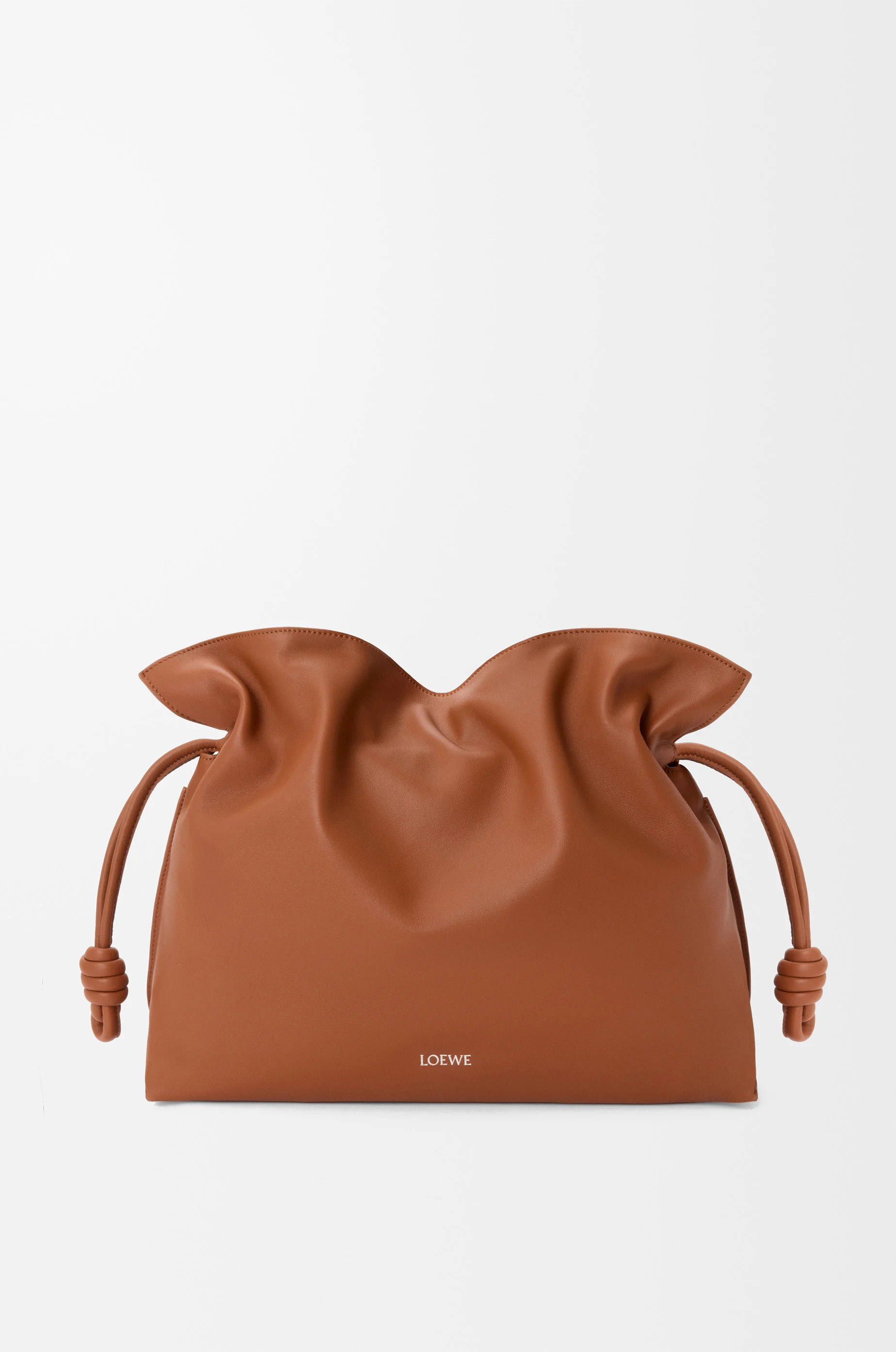 The Flamenco clutch is a soft and slouchy bag with a cinched closure and historical knot drawstrings. This large version is crafted in nappa calfskin. - Shoulder or hand carry - Magnetic closure - One internal zipped pocket - Herringbone cotton canvas lining - Gold or silver embossed LOEWE Colour: Squirrel Metallic colour: Palladium Main material: Nappa calf Handle drop: 29 cm Weight: 0.64 kg Height: 29 cm Width: 38 cm Depth: 14 cm Made in: Spain
