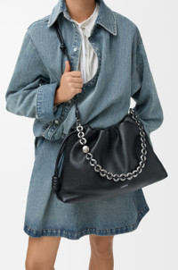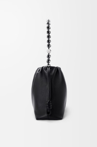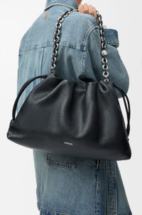 The Flamenco purse is a lightweight and soft bag with a ruched shape, historical knot drawstrings and a donut chain. This large version is crafted in fine grained calfskin. - Shoulder, crossbody or hand carry - Detachable donut chain with Anagram Pebble - Detachable and adjustable leather strap - Magnetic closure - Suede lining - Silver embossed LOEWE Colour: Black Metallic colour: Palladium Main material: Fine grained calf Strap length: 74/ 78 - 139 cm Strap drop: 33/ 40 - 72 cm Weight: 1.0 kg Height: 26 cm Width: 41 cm Depth: 9 cm Made in: Spain