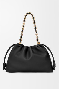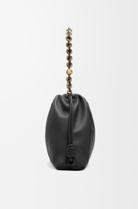 The Flamenco purse is defined by a ruched design complemented by signature knots at the sides. This large version is crafted in mellow nappa lambskin with a thicker donut chain. - Shoulder, crossbody or hand carry - Detachable and adjustable leather strap - Detachable donut chain with an Anagram Pebble - Magnetic closure - Suede lining - Gold or silver embossed LOEWE Details - Colour : Black - Metallic colour : Gold - Main material : Mellow Nappa Lambskin - Strap length : 74/ 78 - 139 cm - Strap Drop : 33/ 40 - 72 cm - Handle drop : 33 cm - Weight : 0.65 kg - Height (cm) : 26 - Width (cm) : 41 - Depth (cm) : 9 - Height (inch) : 10.2 - Width (inch) : 16.1 - Depth (inch) : 3.5 - Model ID : A411FPDX01 - CIL : - 0011208394 - Made in : Spain