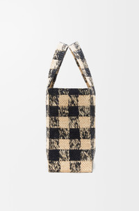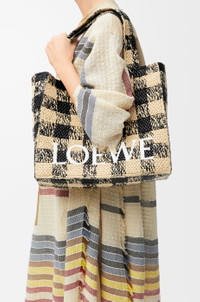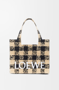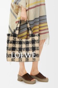 The LOEWE Font tote is a cuboid bag with a contrasting LOEWE signature. It is made in Spain using raffia palm leaves cultivated and handwoven by artisans in Madagascar. This large version features a gingham pattern. - Hand or shoulder carry - One internal calfskin pocket - Unlined Colour: Natural/Black Main material: Raffia Strap length: 107 - 117 cm Strap drop: 52 - 57 cm Handle drop: 27 cm Weight: 1.03 kg Height: 30.5 cm Width: 36.5 cm Depth: 17 cm