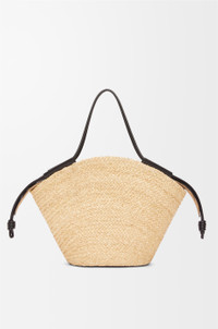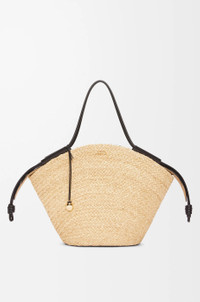 The Paseo basket provides a summery variation on the heritage leather bag. Key details include handles adorned with signature side knots and an Anagram Pebble. This large version is crafted in handwoven raffia and nappa calfskin. - Shoulder or hand carry - Top zip closure - Internal pocket - Metallic LOEWE - Embossed LOEWE on the base Details - Colour: Natural/Black - Metallic colour: Gold - Main material: Raffia/Nappa - Handle drop: 20 cm - Weight: 1.27 kg - Height (cm): 32 - Width (cm): 58 - Depth (cm): 14 - Height (inch): 12.6 - Width (inch): 22.8 - Depth (inch): 5.5 - Model ID: A709G41X06 - CIL: 0011110624 - Made in: Spain