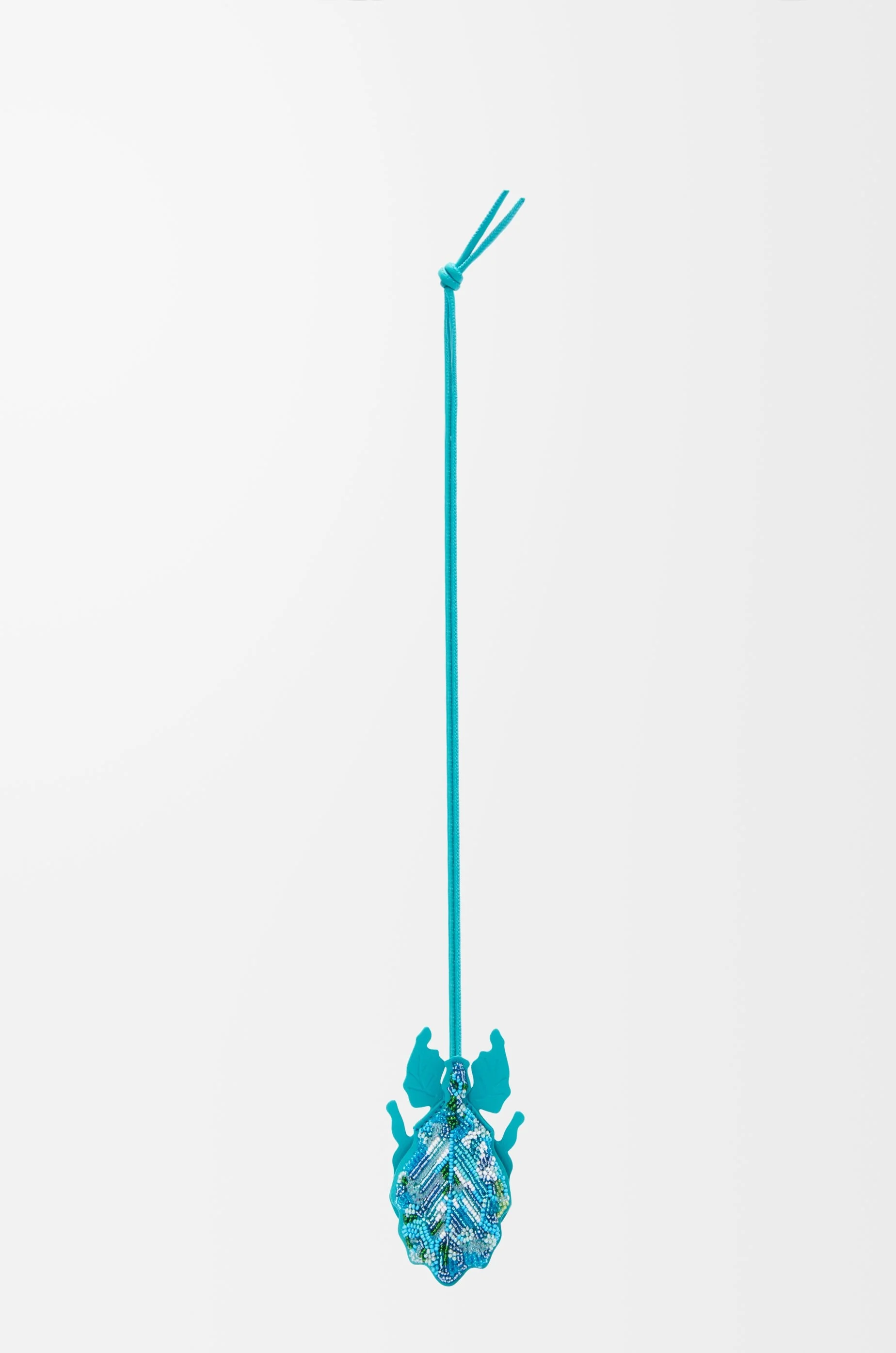 Leaf insect keyfob charm in beaded leather entirely embroidered by hand with a looped calfskin strap and a keyring. Colour: Deep Turquoise Metallic colour: Palladium Main material: Classic Calf/Beads Weight: 0.03 kg Width: 47 cm Depth: 6.1 cm Made in: Spain