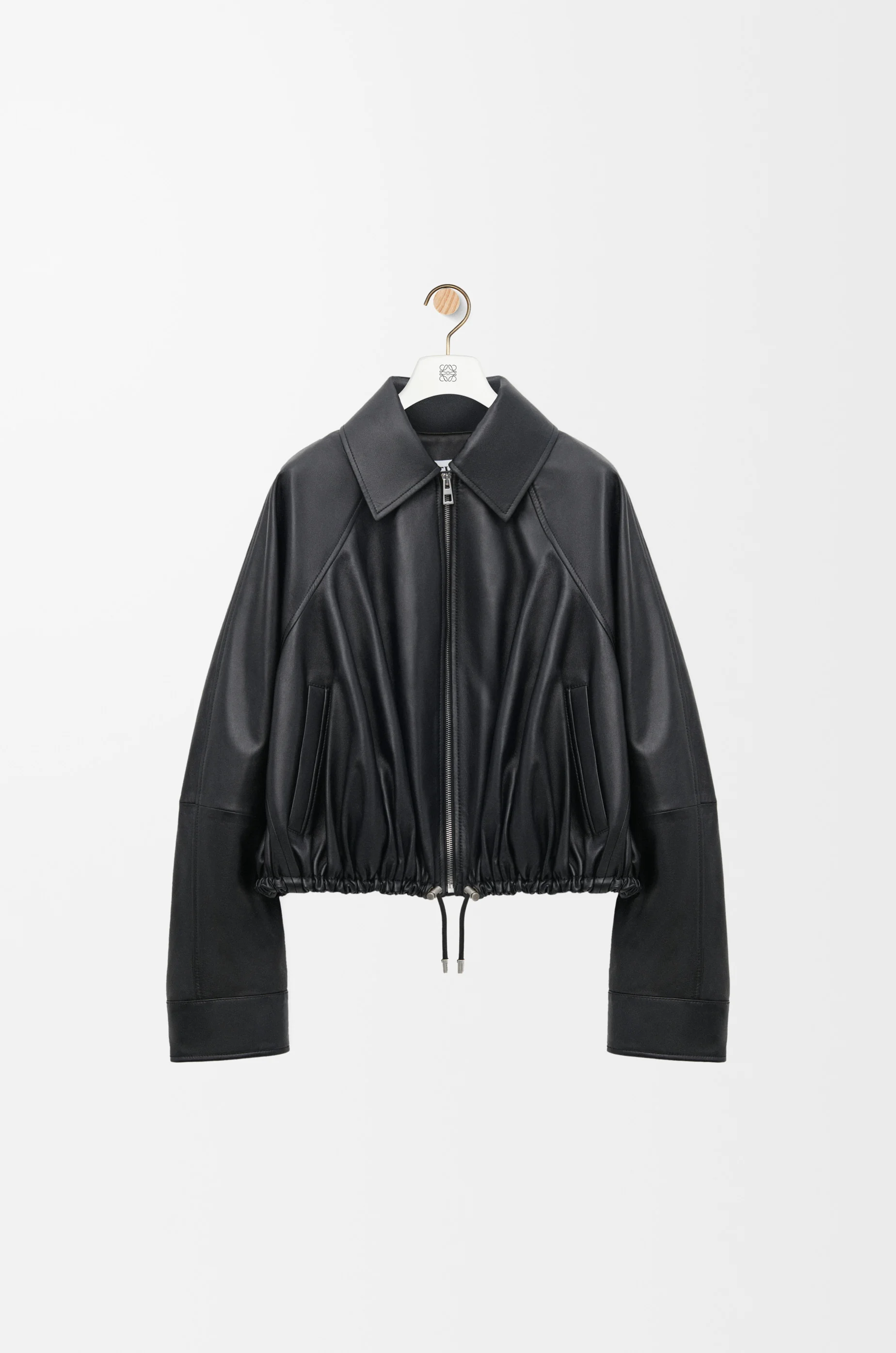 Jacket in lightweight soft nappa lambskin featuring a balloon silhouette with an adjustable leather drawstring hem. - Relaxed fit, regular length - Classic collar - Zip front fastening - Welt pockets, inside LOEWE Anagram leather patch pocket - Fully lined - LOEWE Anagram embossed leather patch placed at the back Details - Colour : Black - Main material : Nappa - Weight : 0.9 kg - Model ID : S359Y34L45 - Made in : Italy