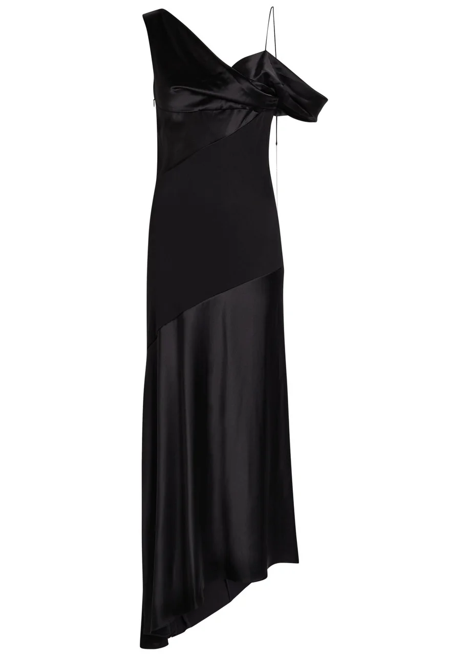 Info & Care Loewe satin;gown Panelled, wrap-effect cowl-neck, gathered bust, logo at hanging chain embellishment, draped details, asymmetric hem, partially lined Concealed zip fastening at side Fabric 1: 76% triacetate, 24% polyester; fabric 2: 100% viscose Dry clean Size & Fit Length shoulder to hem: 1: 52 inches/ 132cm; 2: 59 inches/ 150cm Midweight Slim fit, loose from the lower hips Model is 5'9"/ 175cm and wears a size;FR36