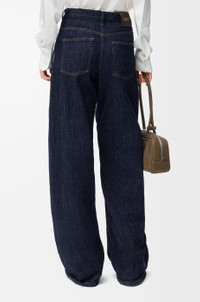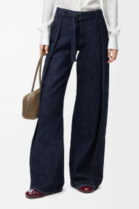 Jeans in lightweight cotton denim featuring an adjustable self belt and pleats at the front. - Regular fit, regular length - Mid waist, straight leg - Concealed zip fly - Slash pockets, rear patch pockets - LOEWE engraved D-ring, LOEWE embossed leather patch placed at the back Colour: Indigo Blue Main material: Cotton/polyurethane Weight: 0.88 kg Made in: Italy Materials & care Main Material: 99% cotton 1% polyurethane