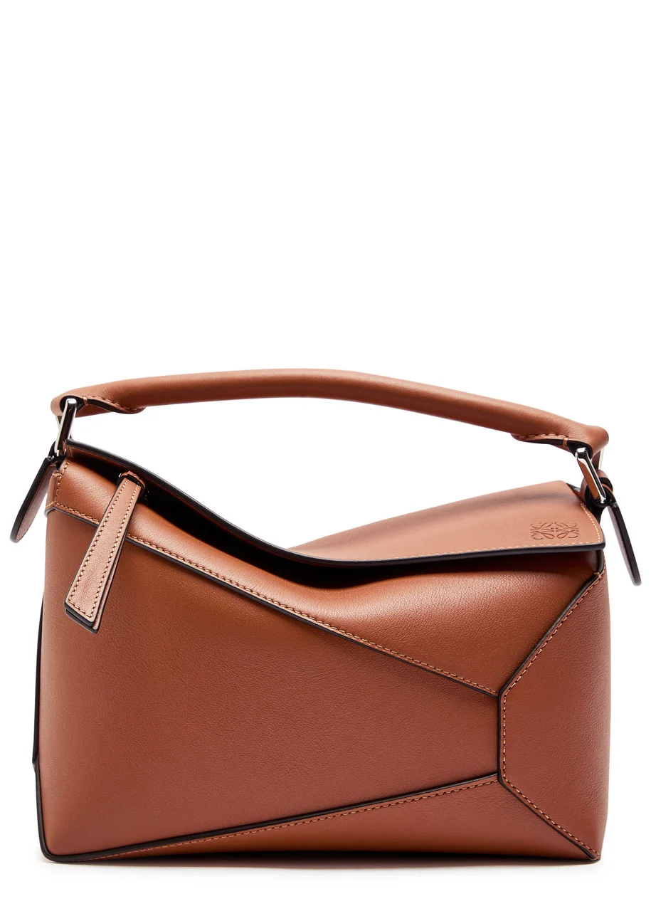Info & Care Loewe leather top handle bag; Top handle, detachable adjustable shoulder strap, debossed Anagram logo, panelled, zip fastening at back, internal slip pocket, fully lined; Concealed zip fastening at top Size & Fit Width: 9.5 inches/ 24cm Height: 6 inches/ 15cm; Depth: 4.5 inches/ 11.5cm Top handle drop: 2 inch/ 5cm Min. shoulder strap drop:;15 inches/ 38cm Max. shoulder strap drop: 22 inches/ 56cm