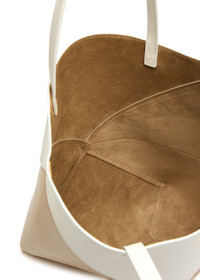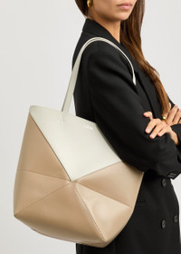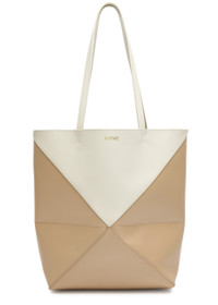 Style Notes The classic tote is reimagined to create Loewe's Puzzle Fold bag. Suspended from two shoulder straps, this medium-sized design is cleverly crafted from geometric panels of shiny leather meaning it can also be folded completely flat.; Info & Care Loewe leather tote Two shoulder straps, panelled, colour-blocked, designer stamped, suede lining Open top; Size & Fit Width: 10 inches/ 25.5cm Height: 12.5 inches/ 32cm Depth: 5.5 inches/ 14cm Shoulder strap;drop: 10 inches/ 25.5cm