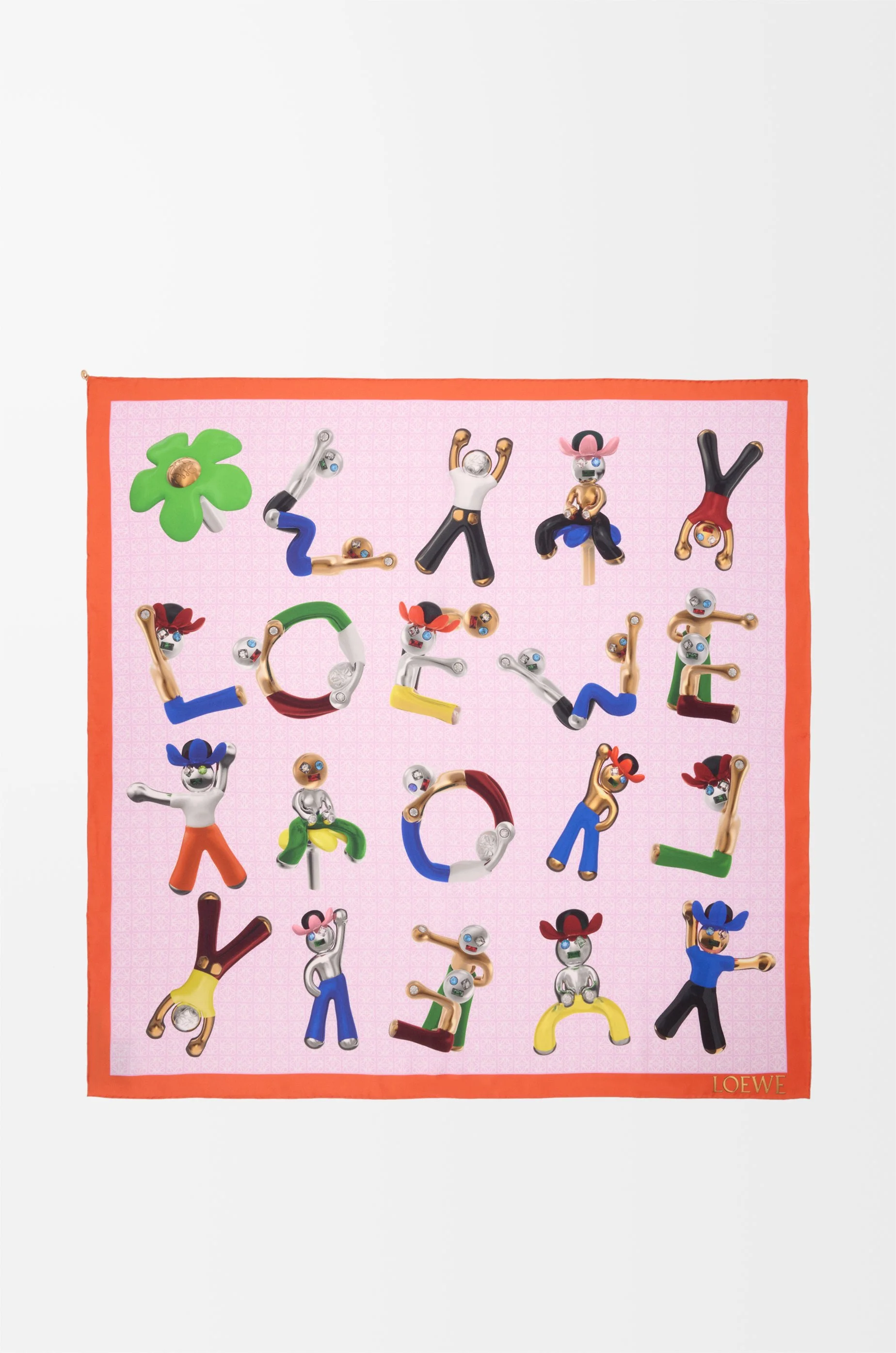 Scarf in lightweight silk twill featuring a placed LOEWE Acrobat print, an allover Anagram pattern and a detachable Anagram Pebble charm. - 90cm x 90cm - Hand-rolled edges Colour: Pink/Multicolor Main material: Silk Weight: 0.054 kg Height: 90 cm Width: 90 cm Made in: Italy