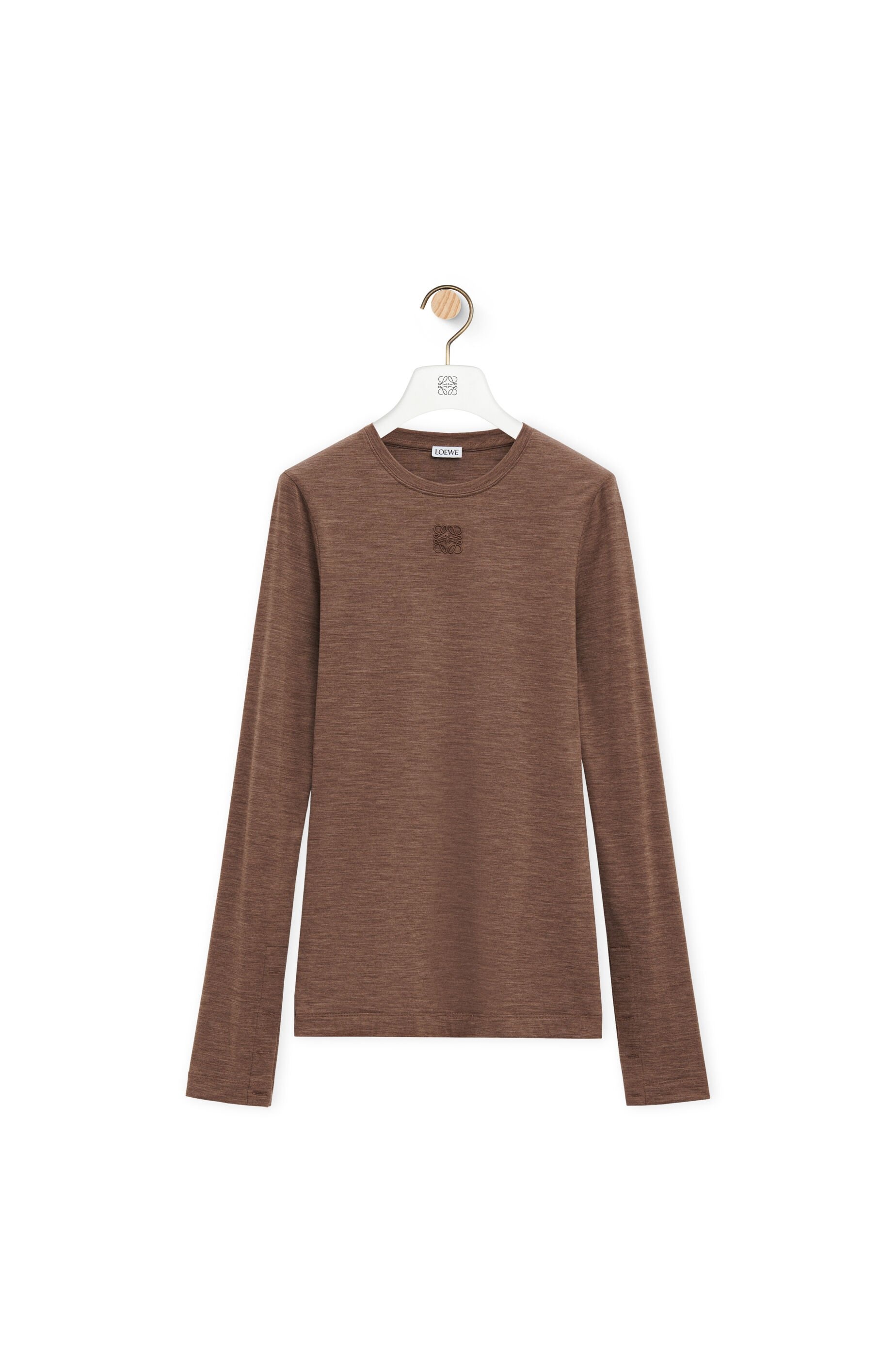 Top in lightweight stretch wool melange featuring a double layer second skin silhouette. - Slim fit, regular length - Crew neck - Anagram embroidery placed at the front Details - Colour : Chocolate Brown - Main material : Wool/Elastane - Weight : 0.4 kg - Model ID : S359Y23XAA - Made in : Portugal