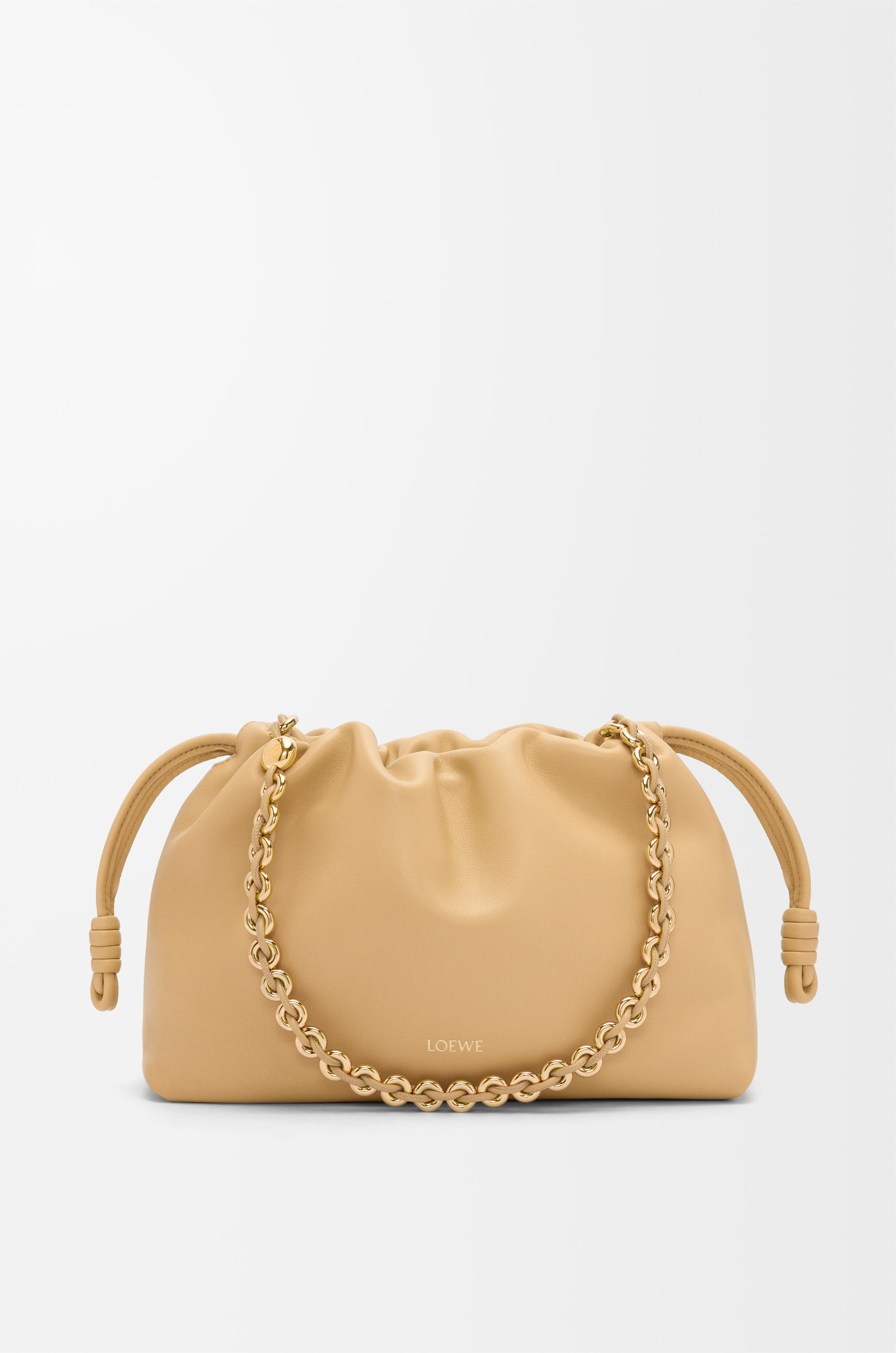 The Flamenco purse is a lightweight and soft bag with a ruched shape, historical knot drawstrings and a donut chain. This medium version is crafted in mellow nappa lambskin. - Shoulder, crossbody or hand carry - Detachable donut chain with Anagram Pebble - Detachable and adjustable leather strap - Magnetic closure - Suede lining - Gold or silver embossed LOEWE Colour: Dark Butter Metallic colour: Gold Main material: Mellow Nappa Lambskin Strap length: 59 / 82 - 142 cm Strap drop: 27 / 37 - 67 cm Weight: 0.31 kg Height: 20 cm Width: 30 cm Depth: 10.5 cm Made in: Spain