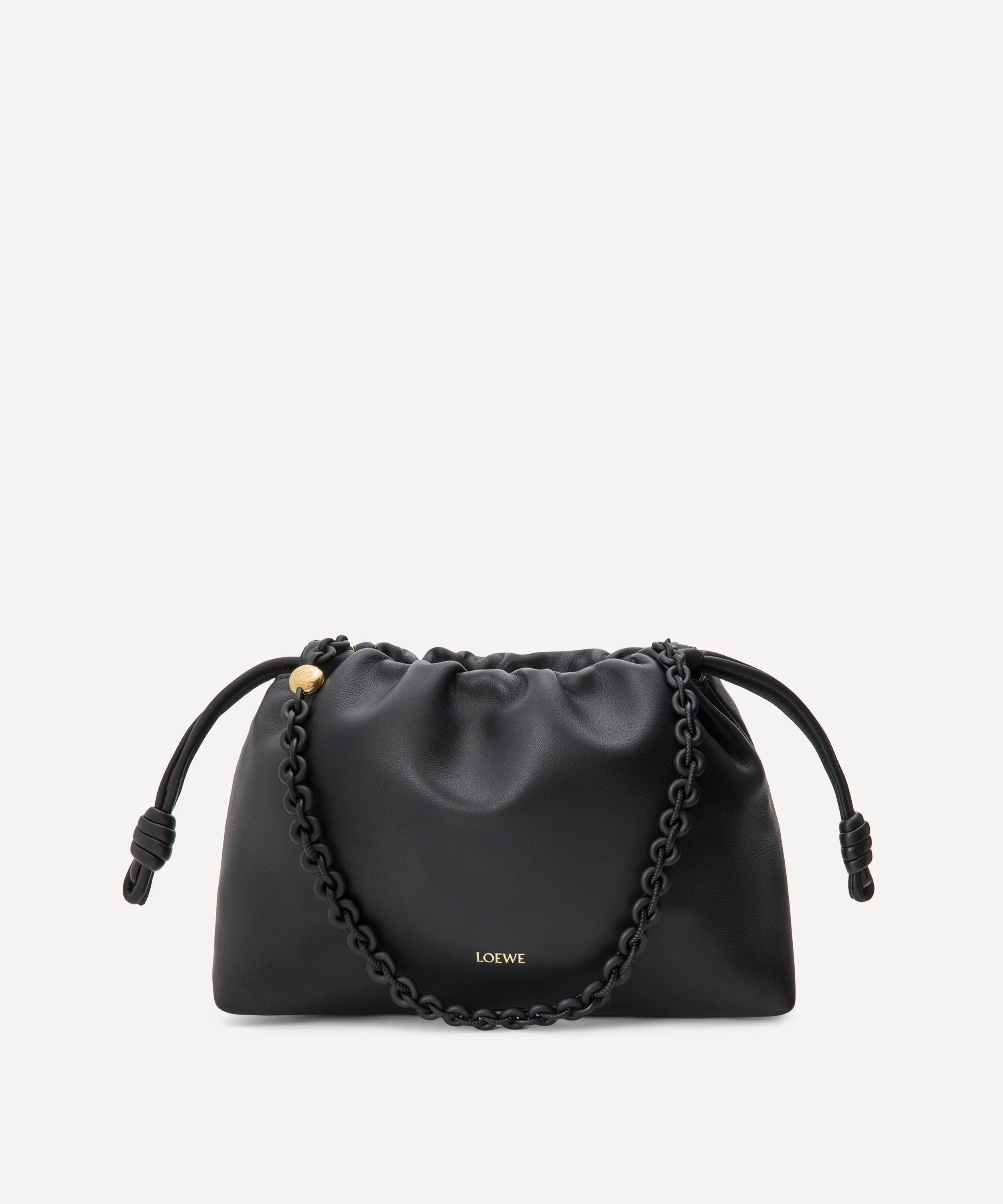 DETAILS Clutch bag Mellow nappa lambskin Suede lining Ruched silhouette Knot drawstring pulls Detachable donut chain strap with Anagram pebble Detachable leather strap Discreet magnetic closure Embossed Loewe logo Made in Spain COMPOSITION & SIZE Nappa Lambskin Leather H: 20cm, W: 30cm, D: 10.5cm