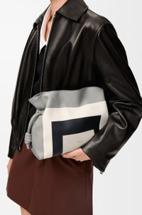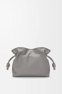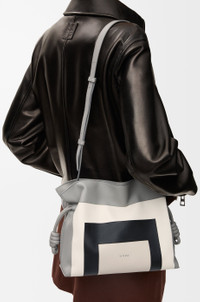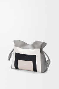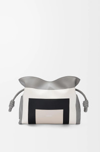 The Flamenco clutch is a soft and slouchy bag with a cinched closure and historical knot drawstrings. This medium version is crafted in nappa calfskin with intarsio squares inspired by Josef Albers's "Homage to the Square" series. This bag is part of the LOEWE x Albers collection. - Shoulder, crossbody or hand carry - Detachable and adjustable strap - Magnetic closure - Suede lining - Gold or silver embossed LOEWE, gold or silver embossed LOEWE and Josef Albers signature Colour: Grey/Light Ghost Metallic colour: Palladium Main material: Nappa Calf Strap length: 96 - 120 cm Strap drop: 38 - 44 cm Weight: 0.5195 kg Height: 24.5 cm Width: 30 cm Depth: 10.5 cm Made in: Spain