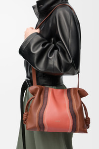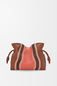 The Flamenco clutch is a soft and slouchy bag with a cinched closure and historical knot drawstrings. This medium version is crafted in nappa calfskin and suede, layered, compressed and skived to create a one-of-a-kind effect. - Shoulder, crossbody or hand carry - Detachable and adjustable strap - Magnetic closure - Suede lining - Gold embossed LOEWE Colour: Pecan/Parrot Pink Metallic colour: Gold Main material: Nappa Calf Strap length: 96 - 120 cm Strap drop: 38 - 44 cm Weight: 0.56 kg Height: 24.5 cm Width: 30 cm Depth: 10.5 cm Made in: Spain