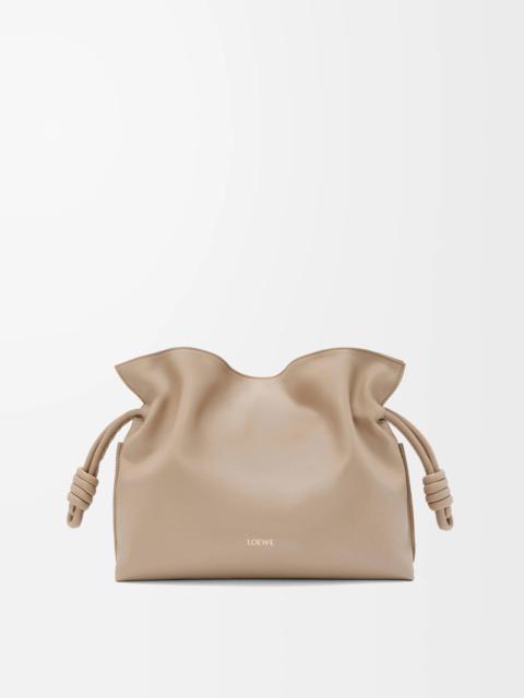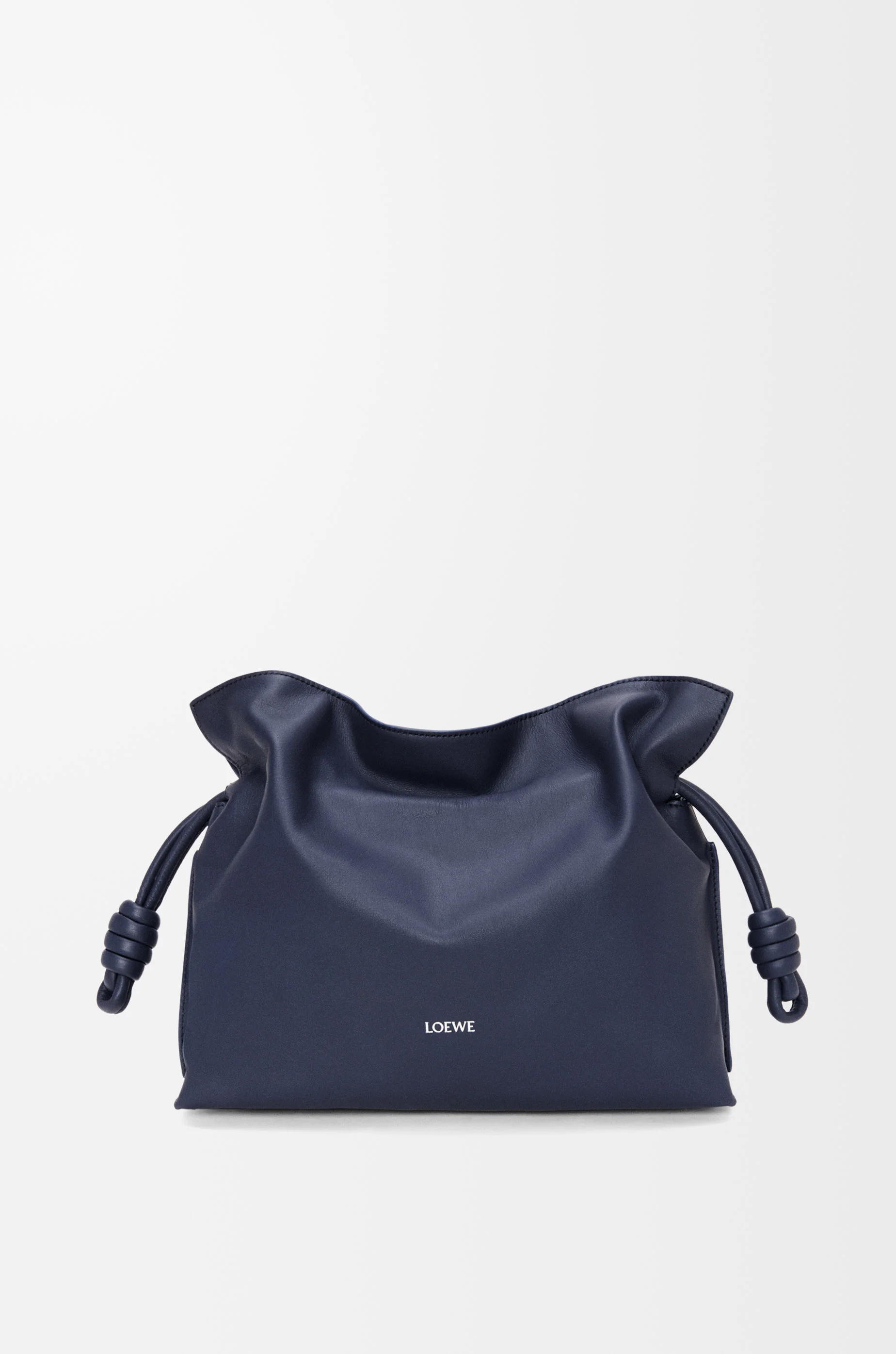 The Flamenco is an iconic design launched in the 1980s. It cinches closed using drawstring pulls finished in signature coiled knots. This medium version is crafted in nappa calfskin. - The medium Flamenco can hold a large wallet, all mobile phones or an A5 notebook, a 0.5L bottle and sunglasses case - Shoulder, crossbody or hand carry - Detachable and adjustable strap - Discreet magnetic closure - Suede lining - Gold or silver embossed LOEWE Details - Colour: Abyss Blue - Metallic colour: Palladium - Main material: Nappa Calf - Strap length: 96 - 120 cm - Weight: 0.5 kg - Height (cm): 24.5 - Width (cm): 30 - Depth (cm): 10.5 - Height (inch): 9.6 - Width (inch): 11.8 - Depth (inch): 4.1 - Model ID: A411FC1XBF - CIL: 0011091568 - Made in: Spain