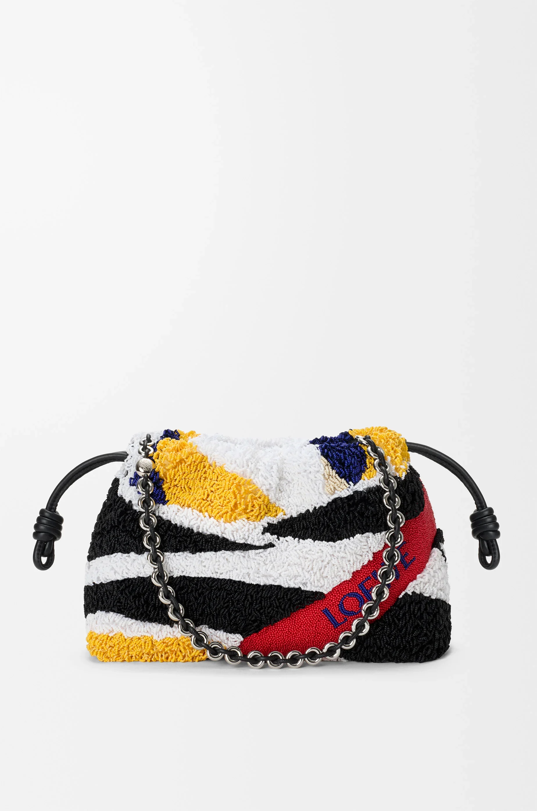 The Flamenco purse is a lightweight and soft bag with a ruched shape, historical knot drawstrings and a donut chain. This medium version is crafted in hand-embroidered nappa leather with boucle-effect beads revealing a graphic archival pattern. - Shoulder, crossbody or hand carry - Detachable donut chain with Anagram Pebble - Detachable and adjustable leather strap - Magnetic closure - Suede lining Colour: Black/Multicolor Metallic colour: Palladium Main material: Embroidered nappa Strap length: 59/ 82 -142 cm Strap drop: 27 / 37 - 67 cm Weight: 0.31 kg Height: 20 cm Width: 30 cm Depth: 10.5 cm Made in: Spain