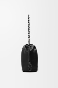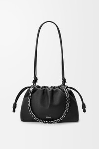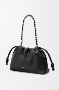 The Flamenco purse is a lightweight and soft bag with a ruched shape, historical knot drawstrings and a donut chain. This medium version is crafted in fine grained calfskin. - Shoulder, crossbody or hand carry - Detachable donut chain with Anagram Pebble - Detachable and adjustable leather strap - Magnetic closure - Suede lining - Silver embossed LOEWE Colour: Black Metallic colour: Palladium Main material: Fine grained calf Strap length: 59 / 82 - 142 cm Strap drop: 27 / 37 - 67 cm Weight: 0.66 kg Height: 20 cm Width: 30 cm Depth: 10.5 cm Made in: Spain