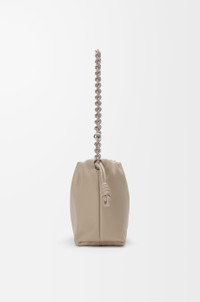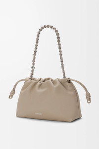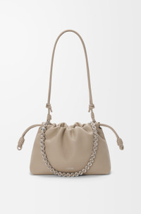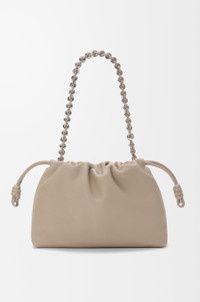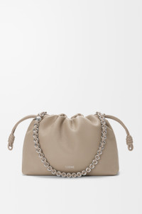 The Flamenco purse is a lightweight and soft bag with a ruched shape, historical knot drawstrings and a donut chain. This medium version is crafted in fine grained calfskin. - Shoulder, crossbody or hand carry - Detachable donut chain with Anagram Pebble - Detachable and adjustable leather strap - Magnetic closure - Suede lining - Silver embossed LOEWE Colour: Clay Metallic colour: Palladium Main material: Fine grained calf Strap length: 59 / 82 - 142 cm Strap drop: 27 / 37 - 67 cm Weight: 0.66 kg Height: 20 cm Width: 30 cm Depth: 10.5 cm Made in: Spain