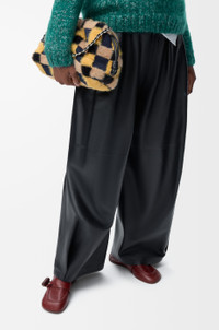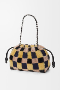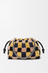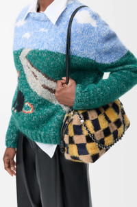 The Flamenco purse is a lightweight and soft bag with a ruched shape, historical knot drawstrings and a donut chain. This medium version is crafted in jacquard knit with silky and fluffy yarns woven into a checked pattern. This bag is inspired by Louis Wain's "Futurist Cats" porcelain vase series. - Shoulder, crossbody or hand carry - Detachable donut chain with Anagram Pebble - Detachable and adjustable leather strap - Magnetic closure - Suede lining Colour: Multicolor Deep Navy Metallic colour: Palladium Main material: Jacquard knit Strap length: 59 / 82 - 142 cm Strap drop: 27 / 37 - 67 cm Weight: 0.71 kg Height: 20 cm Width: 30 cm Depth: 10.5 cm Made in: Spain