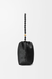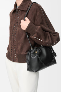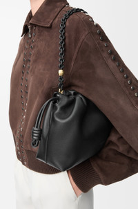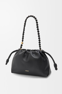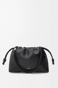 The Flamenco purse is a lightweight and soft bag with a ruched shape, historical knot drawstrings and a donut chain. This medium version is crafted in mellow nappa lambskin with a tonal chain. - Shoulder, crossbody or hand carry - Detachable tonal donut chain with Anagram Pebble - Detachable and adjustable leather strap - Magnetic closure - Suede lining - Gold or silver embossed LOEWE Colour: Black Metallic colour: Gold Main material: Mellow Nappa Lambskin Strap length: 59 / 82 - 142 cm Strap drop: 27 / 37 - 67 cm Weight: 0.463 kg Height: 20 cm Width: 30 cm Depth: 10.5 cm Made in: Spain