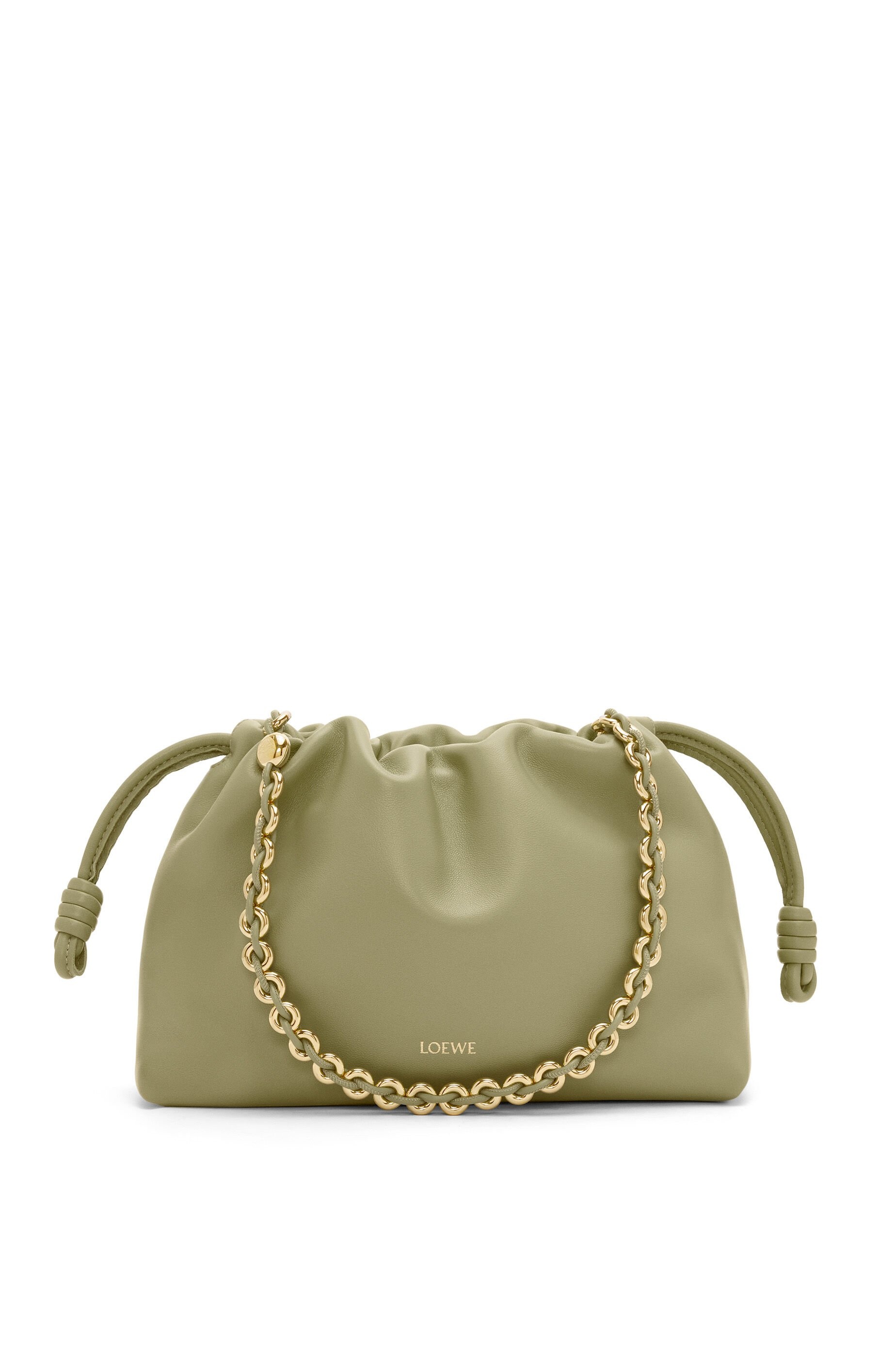 The Flamenco purse is defined by a ruched design inspired by the Flamenco line's aesthetics, with key details such as the signature knots at the sides and the donut chain. This medium version is crafted in mellow nappa lambskin. - Shoulder, crossbody or hand carry - Detachable and adjustable leather strap - Detachable donut chain adorned with an Anagram Pebble - Discreet magnetic closure - Suede lining - Gold or silver embossed LOEWE Details - Colour : Eucalyptus Green - Metallic colour : Gold - Main material : Mellow Nappa Lambskin - Strap length : 59 / 82 - 142 cm - Strap drop : 27 / 37 - 67 cm - Weight : 0.31 kg - Height (cm) : 20 - Width (cm) : 30 - Depth (cm) : 10.5 - Height (inch) : 7.9 - Width (inch) : 11.8 - Depth (inch) : 4.1 - Model ID : A411FCRX02 - CIL : - 0011180841 - Made in : Spain