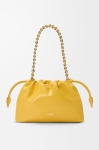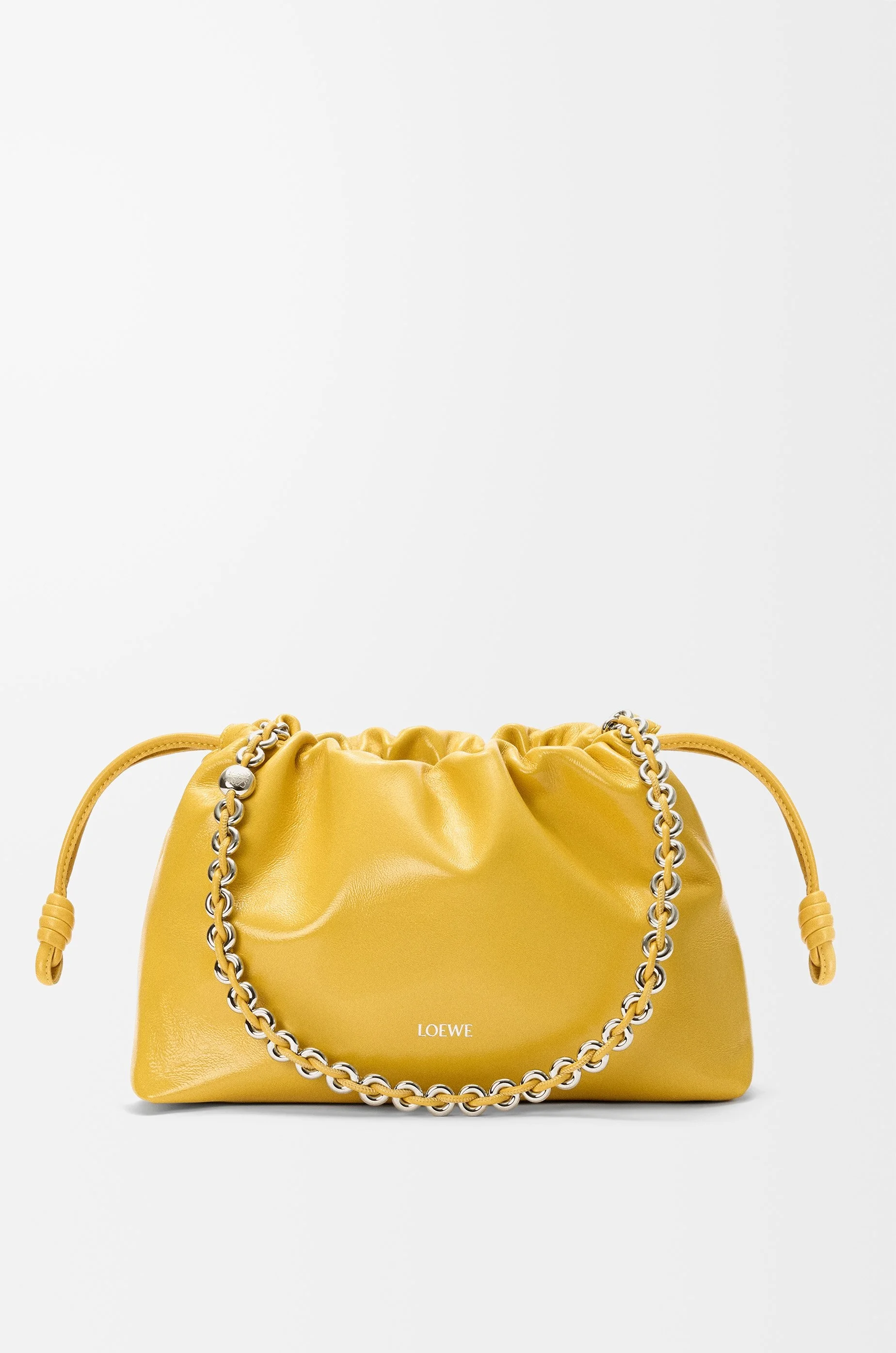 The Flamenco purse is a lightweight and soft bag with a ruched shape, historical knot drawstrings and a donut chain. This medium version is crafted in patent nappa lambskin. - Shoulder, crossbody or hand carry - Detachable tonal donut chain with Anagram Pebble - Detachable and adjustable leather strap - Magnetic closure - Suede lining - Silver embossed LOEWE Colour: Yellow Metallic colour: Palladium Main material: Patent Nappa Lambskin Strap length: 59 / 82 - 142 cm Strap drop: 27 / 37 - 67 cm Weight: 0.44 kg Height: 20 cm Width: 30 cm Depth: 10.5 cm Made in: Spain