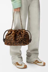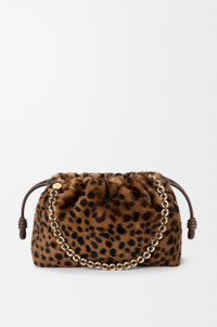 The Flamenco purse is a lightweight and soft bag with a ruched shape, historical knot drawstrings and a donut chain. This medium version is crafted in leopard-print shearling. - Shoulder, crossbody or hand carry - Detachable donut chain with Anagram Pebble - Detachable and adjustable leather strap - Magnetic closure - Suede lining Colour: Beige/Brown Metallic colour: Gold Main material: Leopard printed shearling Strap length: 59 / 82 - 142 cm Strap drop: 27 / 37 - 67 cm Weight: 0.53 kg Height: 20 cm Width: 30 cm Depth: 10.5 cm Made in: Spain